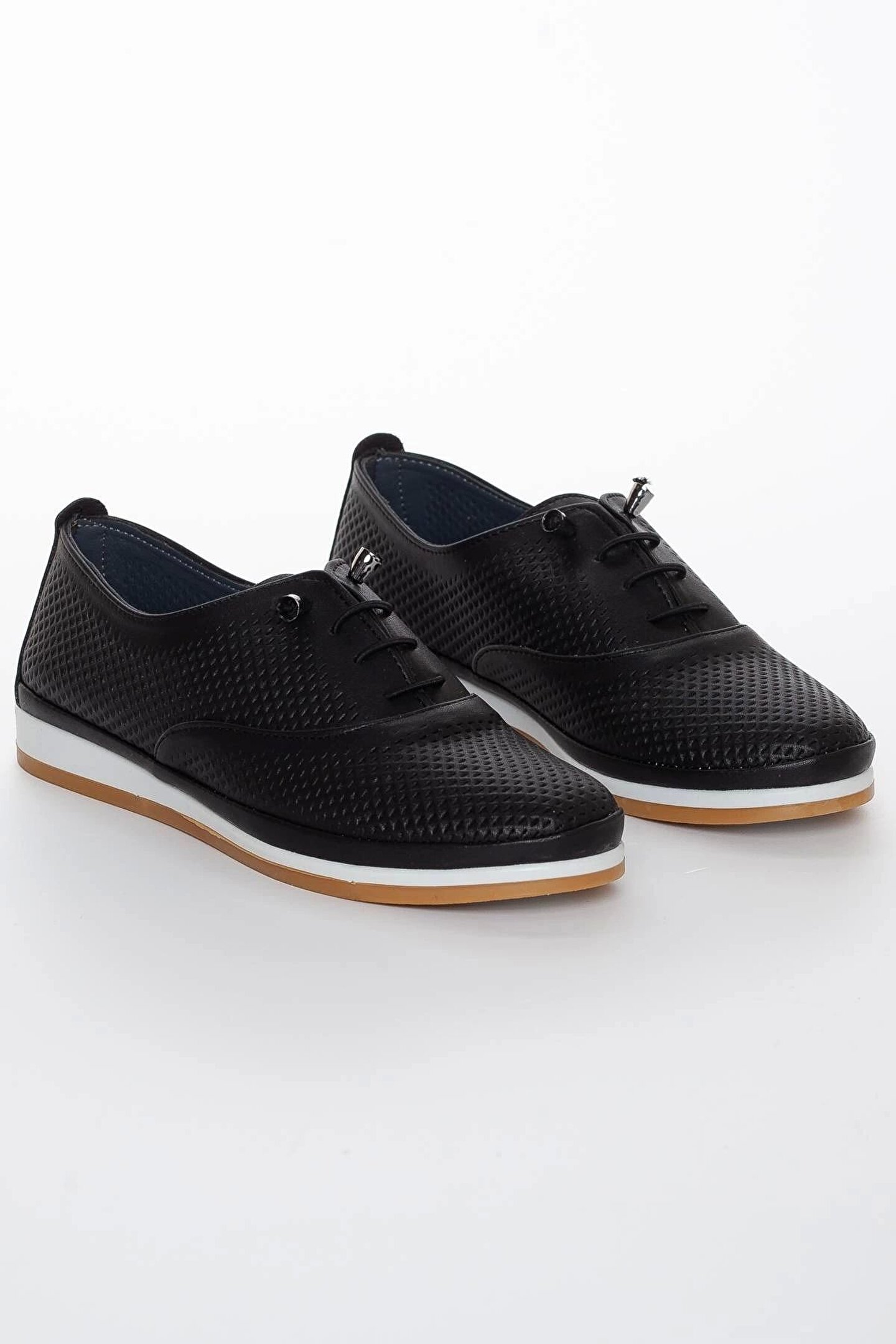 Hakiki Deri Kadın Günlük Ayakkabı Siyah Bağcıklı Lazer Işlemeli