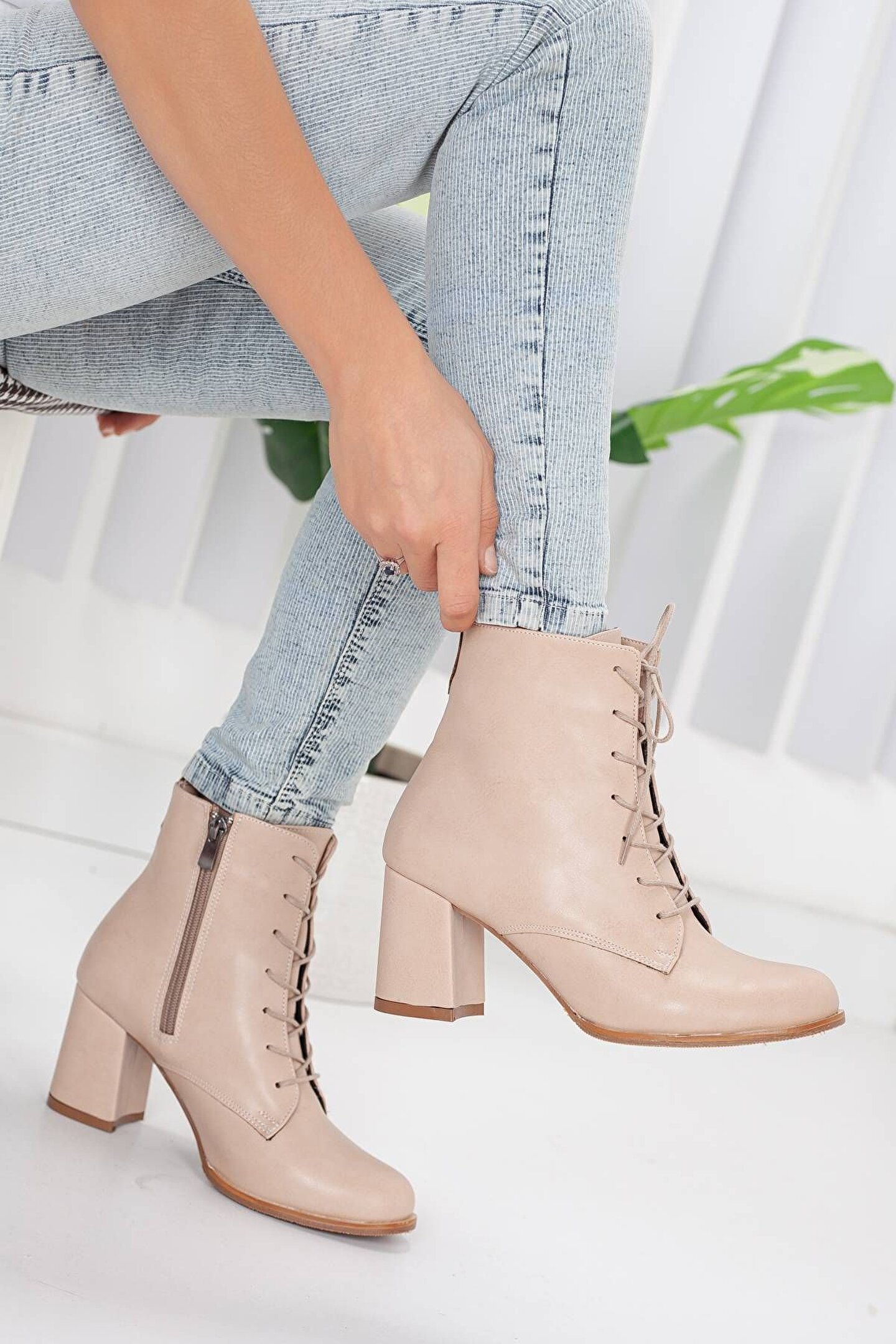 Kadın Günlük Bot Fermuarlı Bağcıklı Yuvarlak Burun Bej Cilt