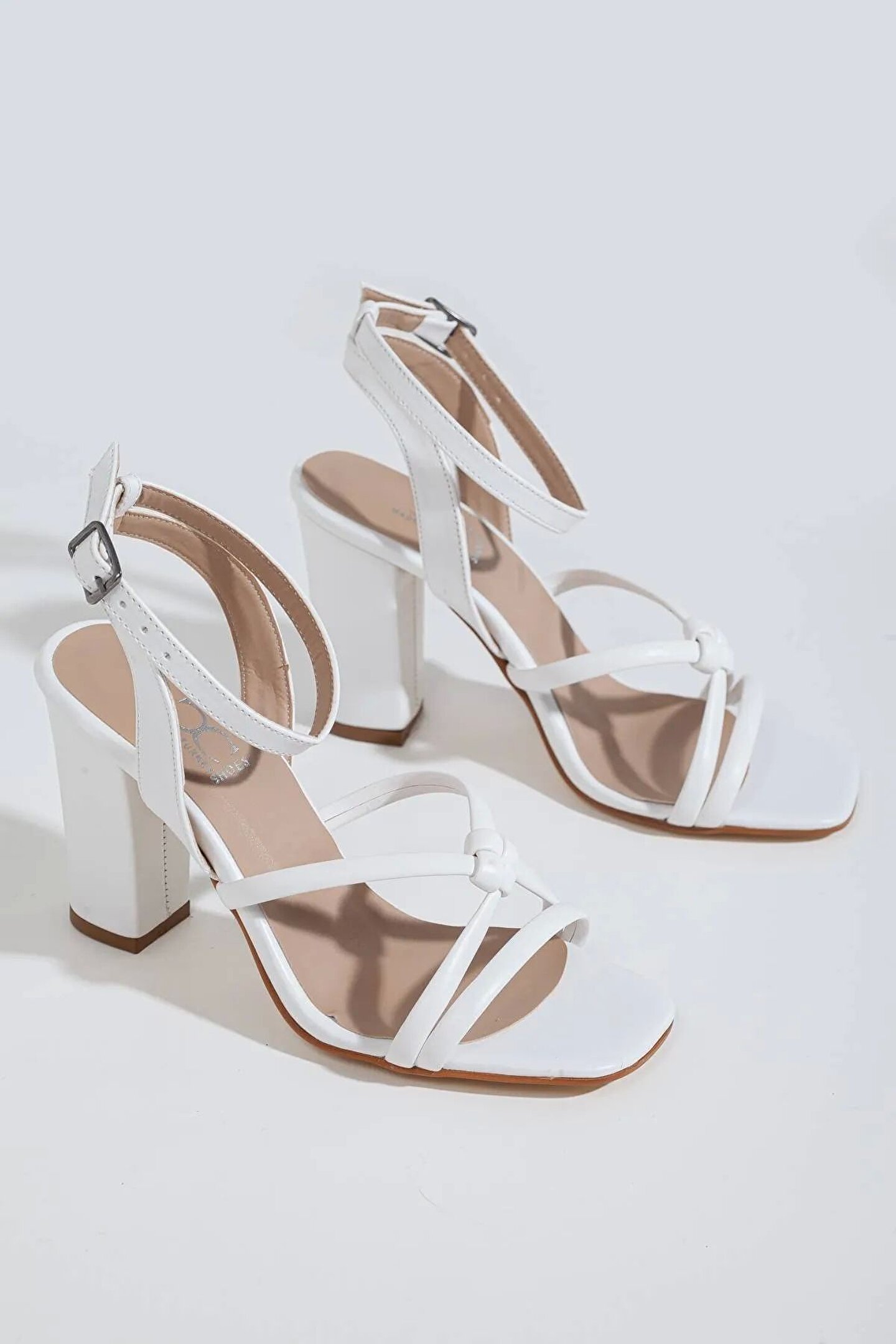 Kadın Kalın Yüksek Topuklu Biyeli Bantlı Yazlık Beyaz Ayakkabı