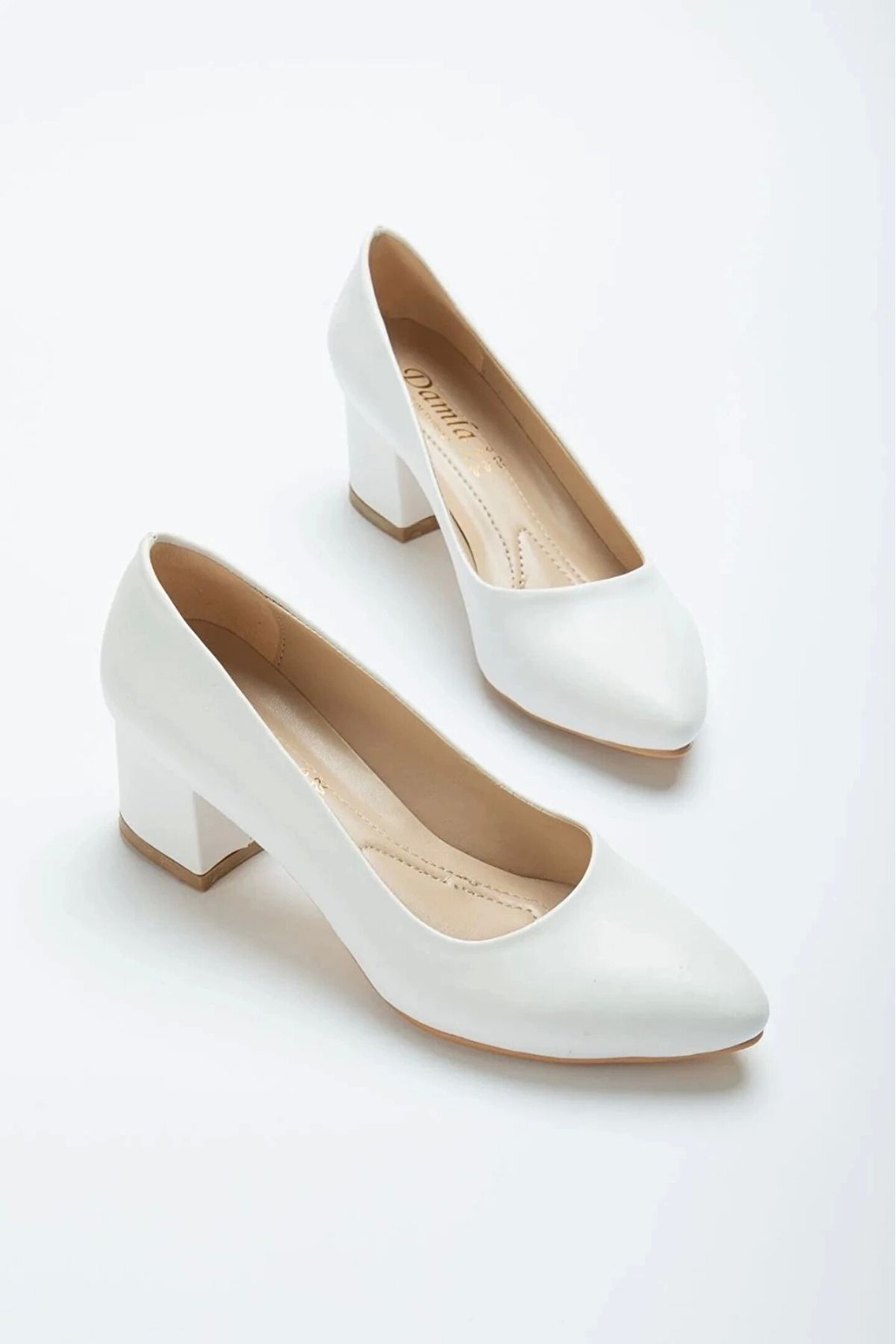 Kadın Klasik Kalın Ökçeli Mat Beyaz 5 Cm Stiletto