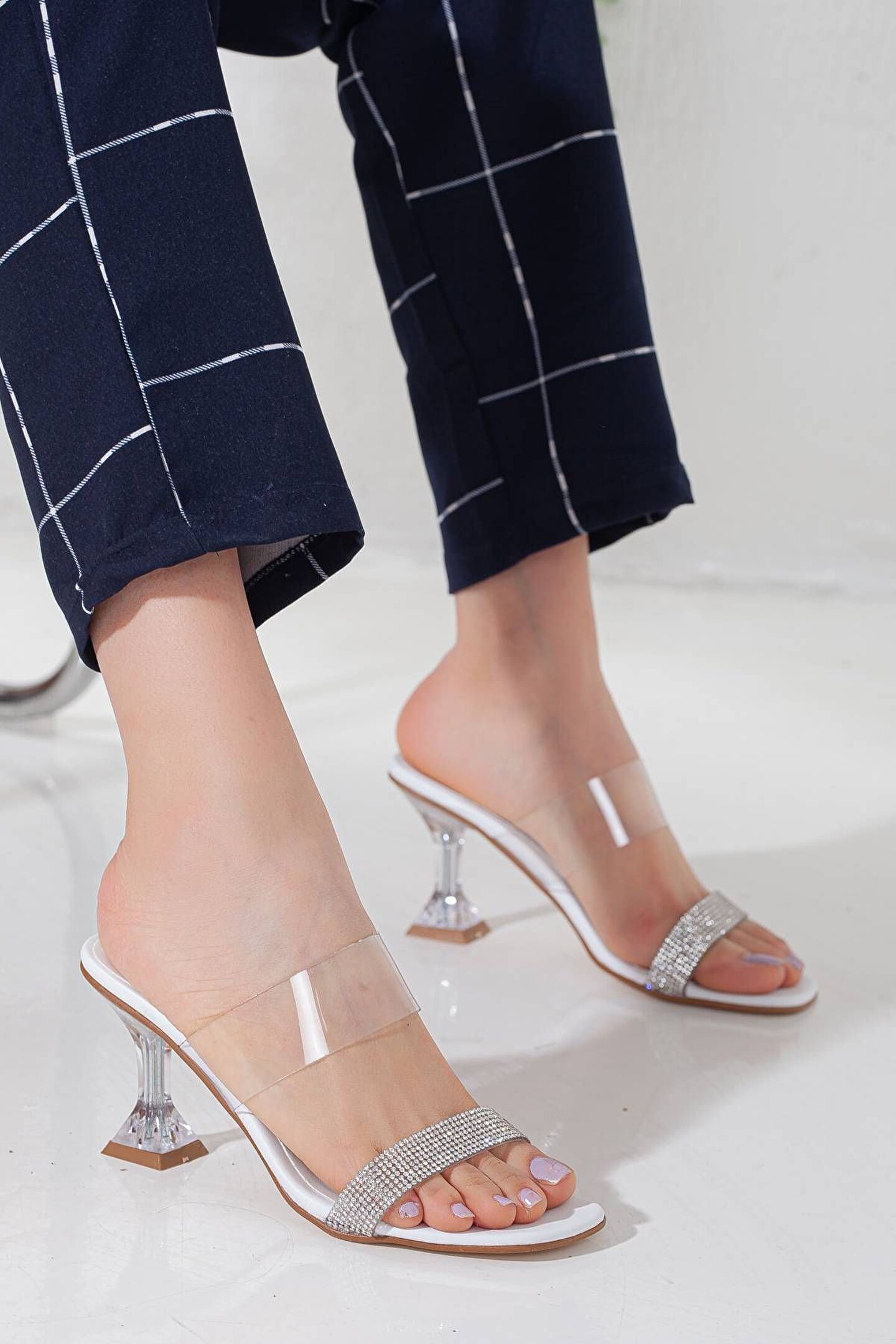 Kadın Taş Detaylı Şeffaf Terlik Beyaz