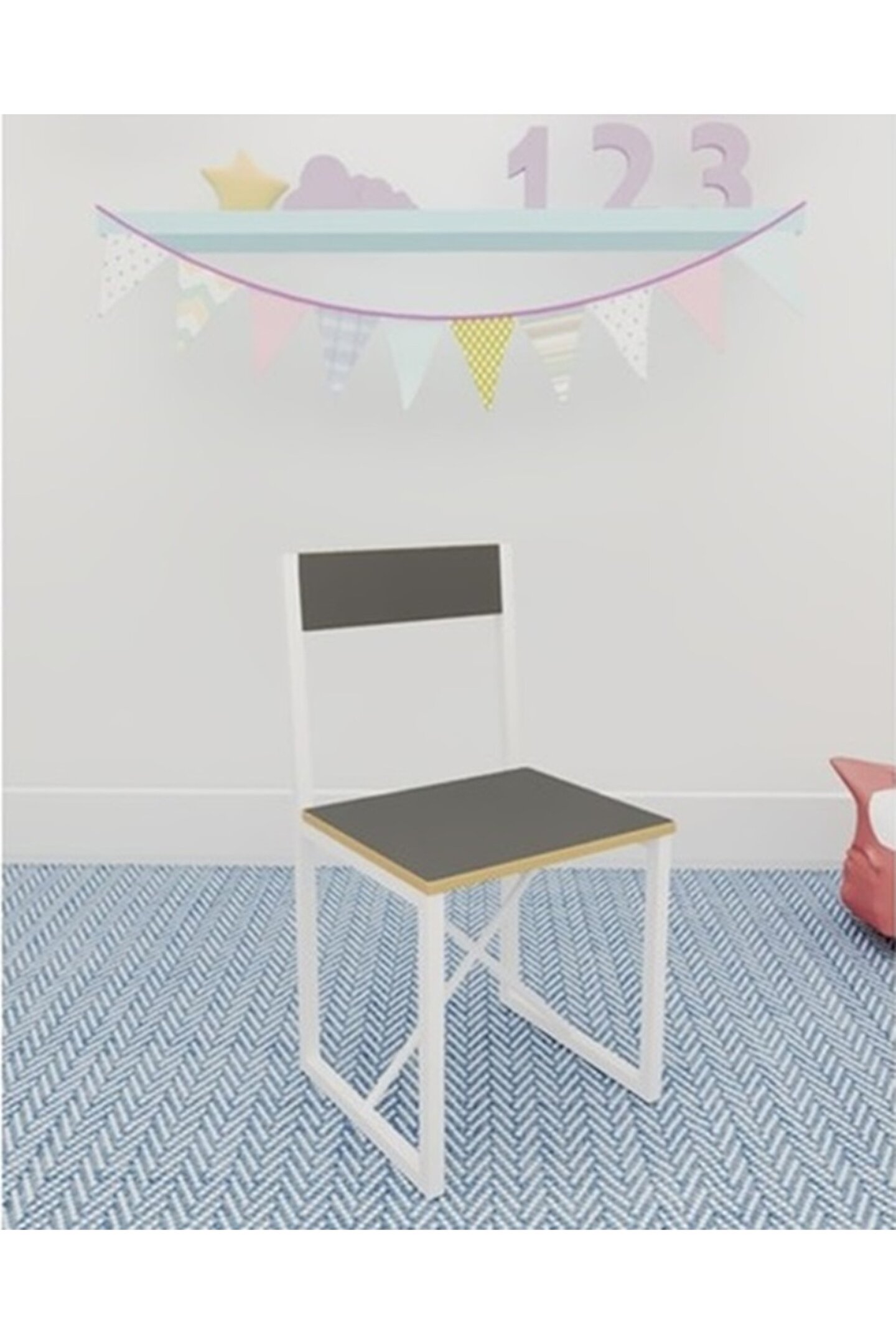 ve sandalyesi metal profil ayaklar, masanın kararlılığını artırırken, modern ve minimalist tasarımı, çocuk odalarına çağdaş bir hava katıyor.