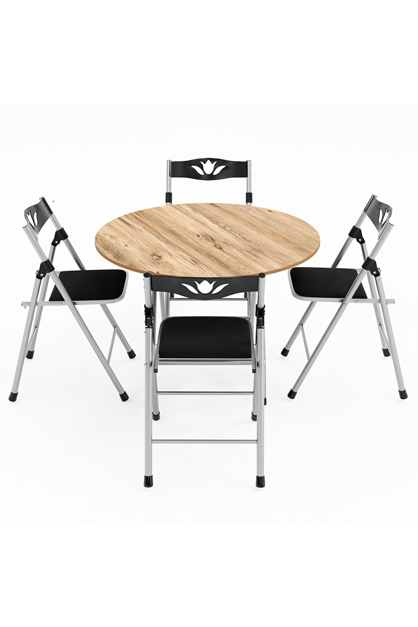 Katlanır Masa Yuvarlak Kırma Mutfak Masası, modern ve işlevsel bir mobilyadır. Bu set, özellikle küçük mutfaklar, yemek odaları veya çok amaçlı alanlar için tasarlanmıştır. 70 çap boyutlarındaki masa, ideal bir yemek yüzeyi sunarken, katlanabilir sandalyeler alanı en verimli şekilde kullanmanıza olanak tanır. Setin tasarımında, Atlantik Çam'ın doğal dokusu ve MDF, görsel bir zenginlik ve modern bir dokunuş ekler. Masa ve sandalyeler, elektrostatik boyalı metal ayaklar sayesinde ekstra sağlamlık kazanır. Bu yapı, günlük kullanıma uygun dayanıklılık sunarken, şık bir görünümle mekanınızı güzelleştirir. Katlanabilir masa ve sandalyeler, küçük yaşam alanlarında büyük bir avantaj sağlar. Setin kolay katlanabilir olması, sınırlı depolama alanlarında bile rahatlıkla saklanabilmesine imkan verir. Bu özellik, özellikle apartman dairesi gibi yerlerde yaşayanlar için idealdir, kullanılmadığı zamanlarda masa ve sandalyeleri kolayca kaldırıp alan açabilirsiniz. Set, fonksiyonelliği ve şıklığı bir arada sunarak, her türlü iç mekan dekorasyonuna uyum sağlayacak şekilde tasarlanmıştır.