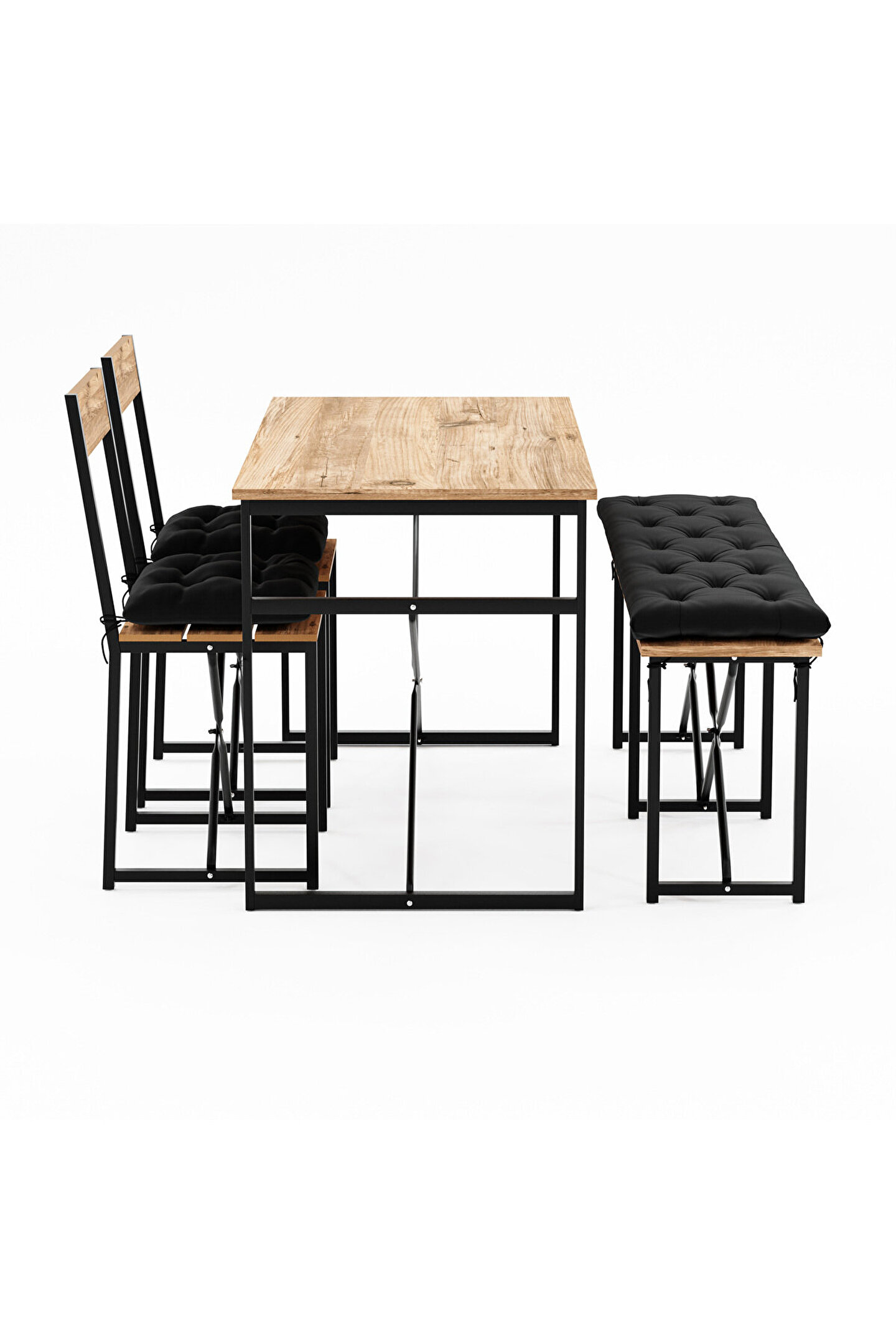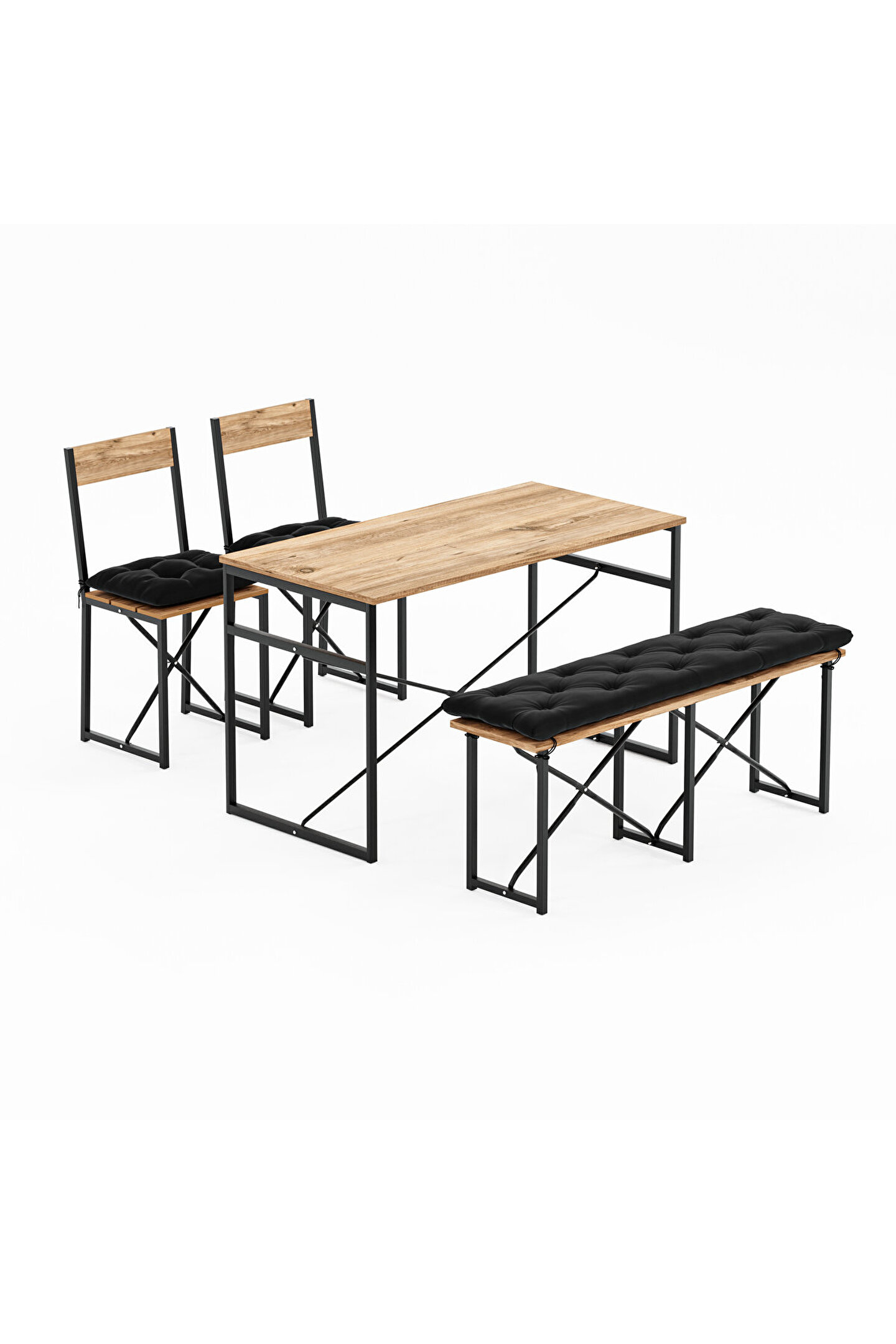 Set, fonksiyonel beklentileri estetik ile buluşturan dinamik bir yapıya sahiptir. 120 cm x 60 cm ölçülerindeki geniş masa tablası, yemeklerinizi, çalışmalarınızı veya toplantılarınızı rahatça gerçekleştirebileceğiniz bir alana sahiptir. 70 cm'lik ideal yüksekliği, ergonomik bir oturma ve kullanım deneyimi sağlar. Ayrıca, bench ve sandalyelerin uyumlu tasarımı, göze hitap ettiği kadar konfor da sunar.