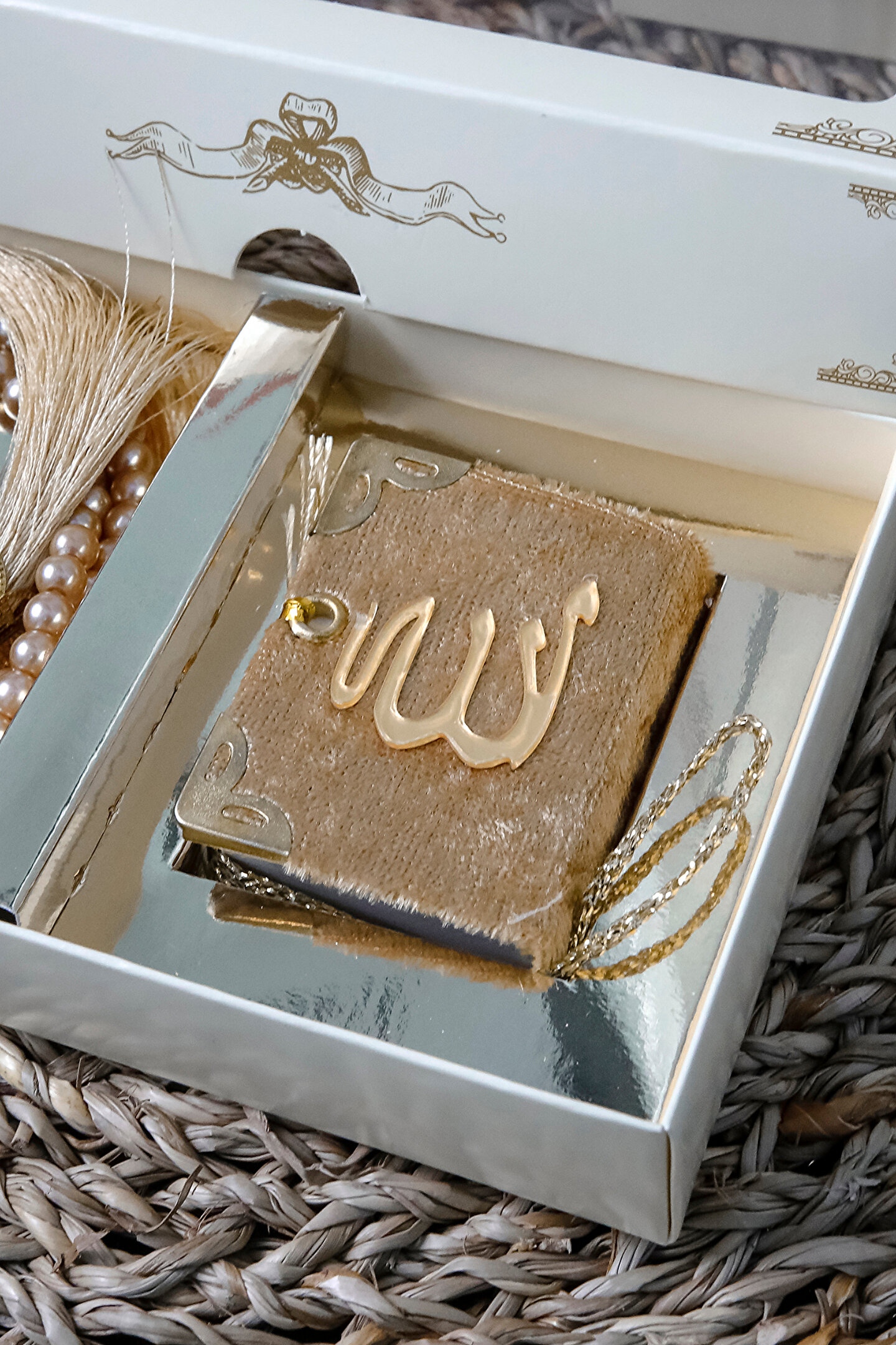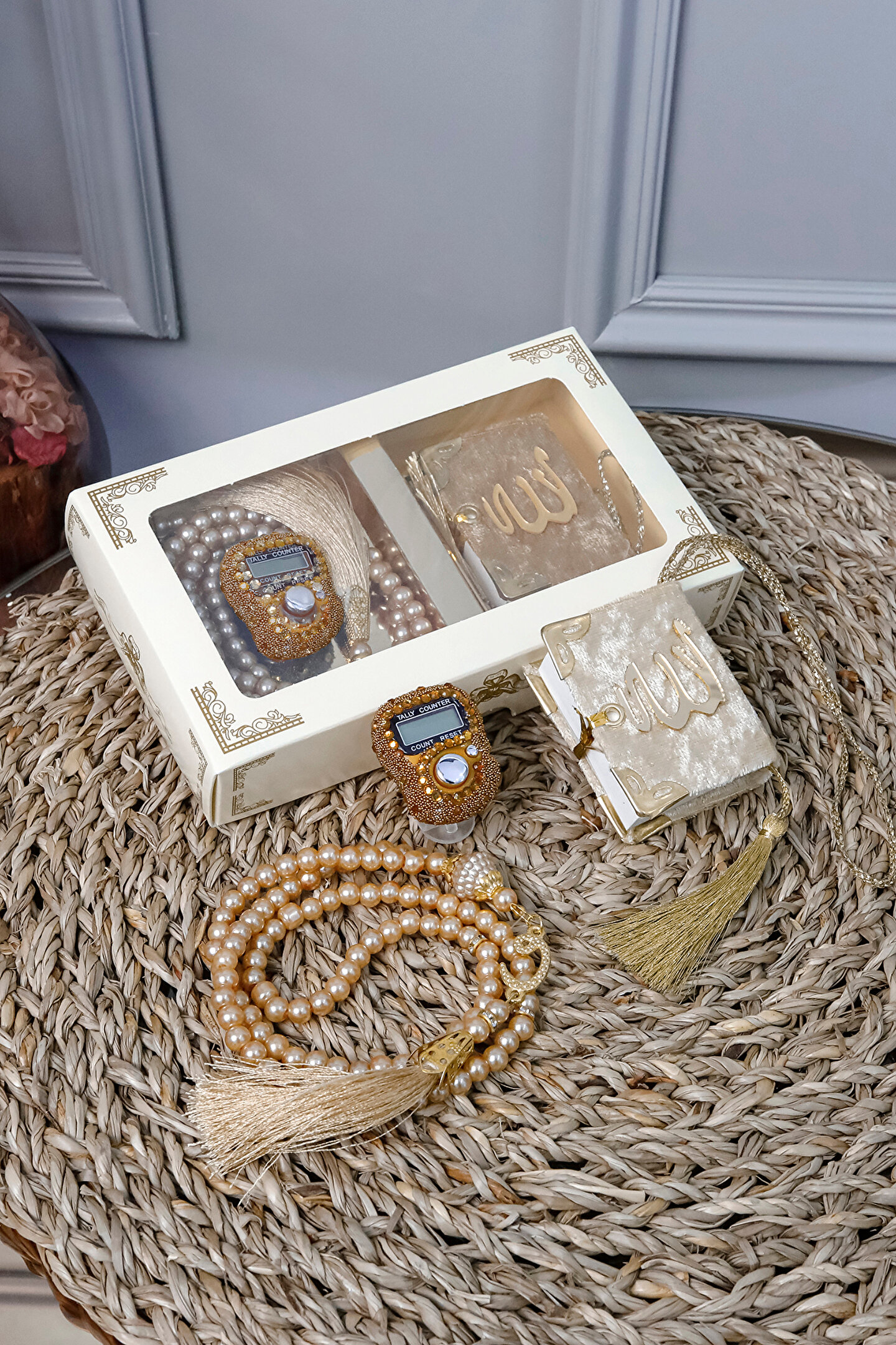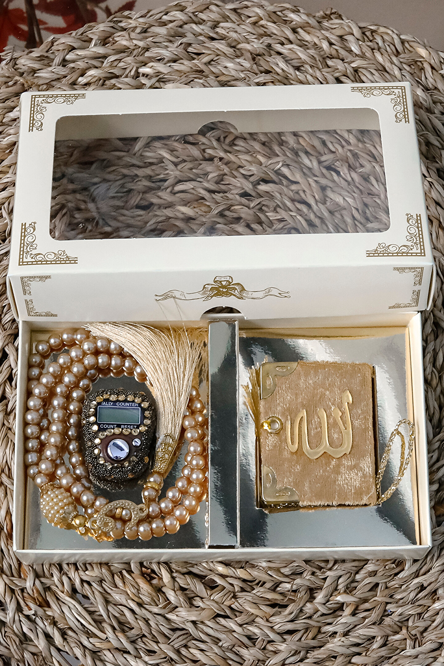 Hac Umre Hediyelik 10 Adet - Taşlı Zikirmatik Tesbihmatik Kadife Kaplı Mini Kuran 99lu İnci Tesbih Seti