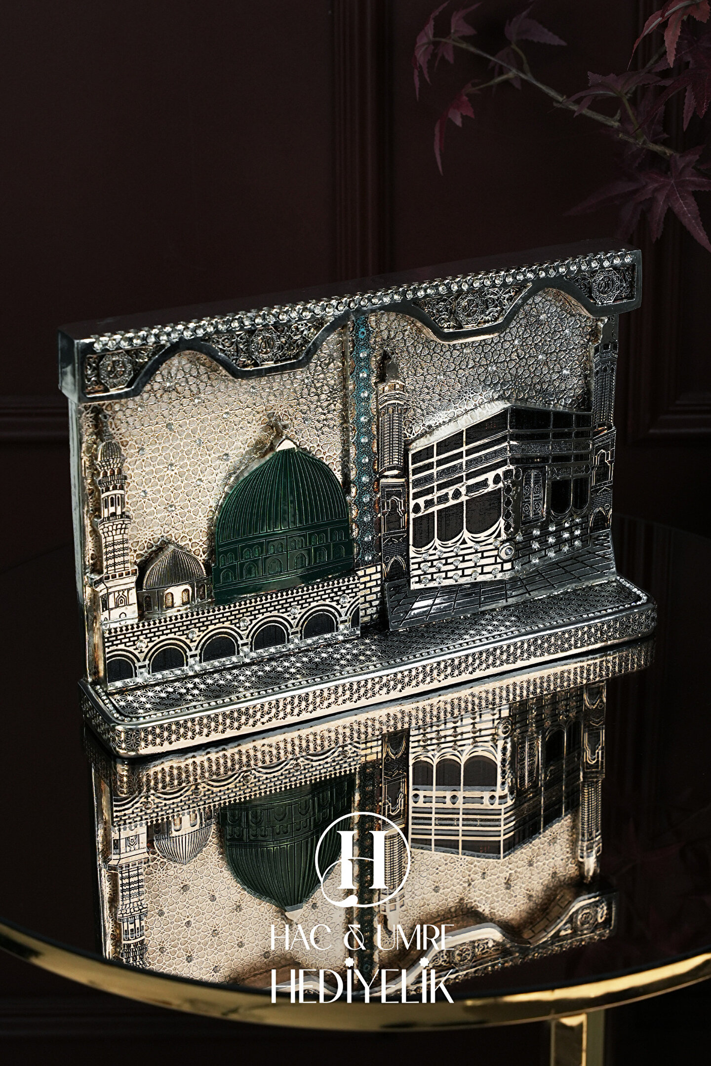 Hac Umre Hediyelik Hac Umre Hediyesi | İslami Dekor | Kabe ve Mescidi Nebevi Gümüş Dekor | İkili Mekke Medine Biblosu