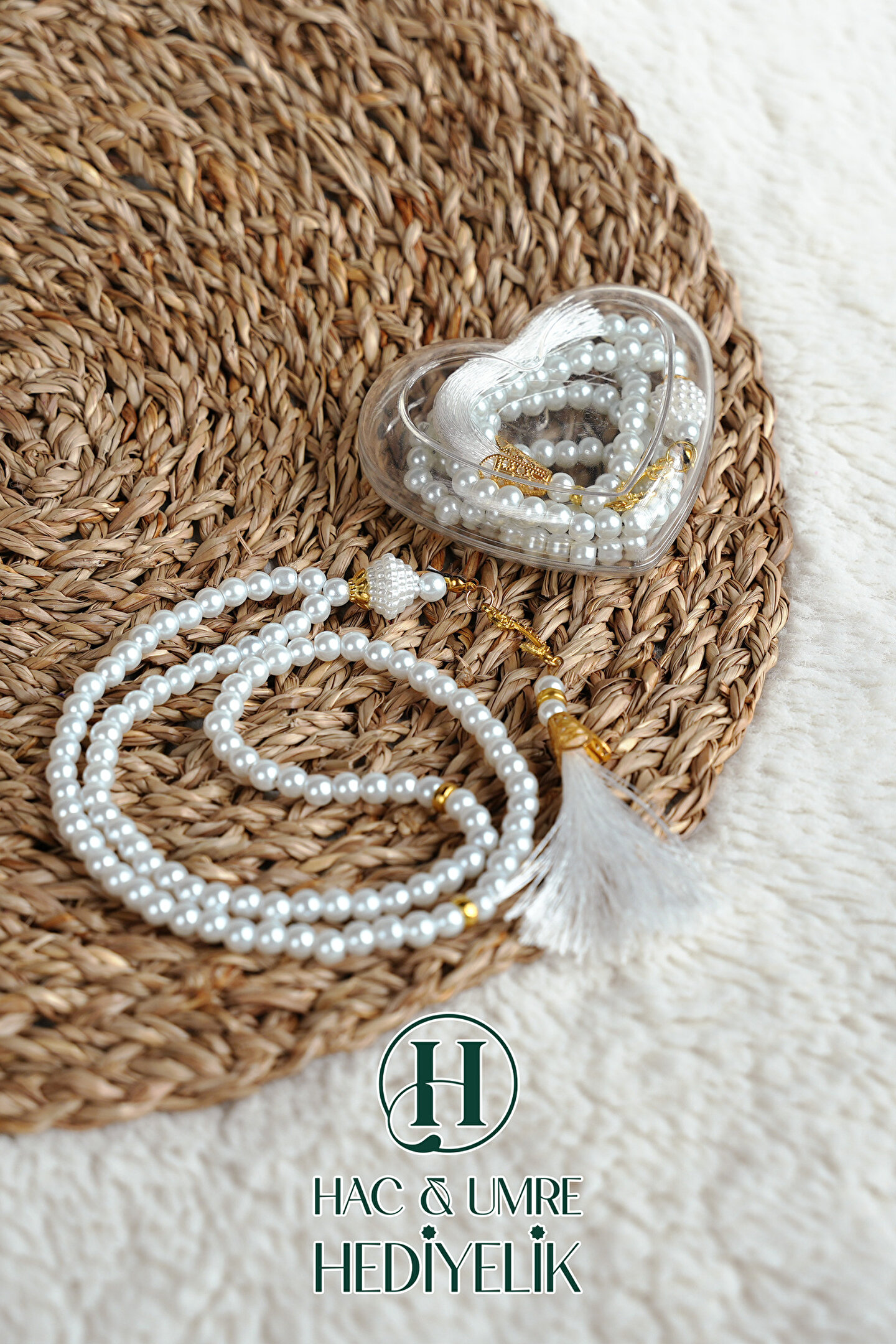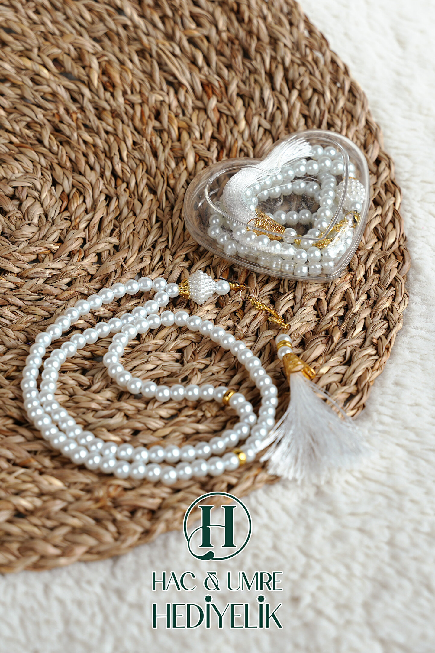 Hac Umre Hediyelik Hediyelik Tesbih | 99lu İnci Tesbih Vav İmameli Püsküllü Kalp Kutulu | Hac Umre Gün Davet Hediyesi