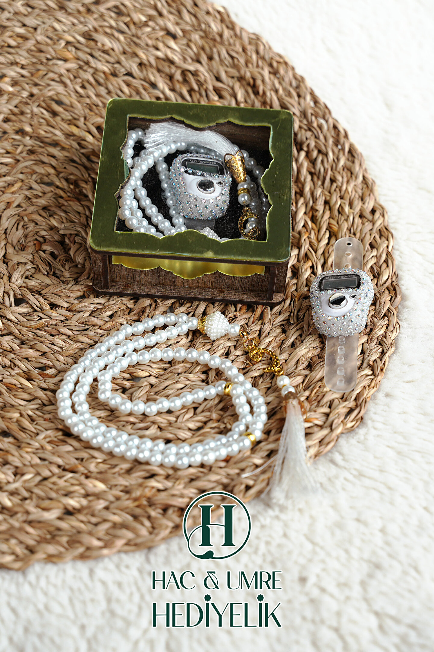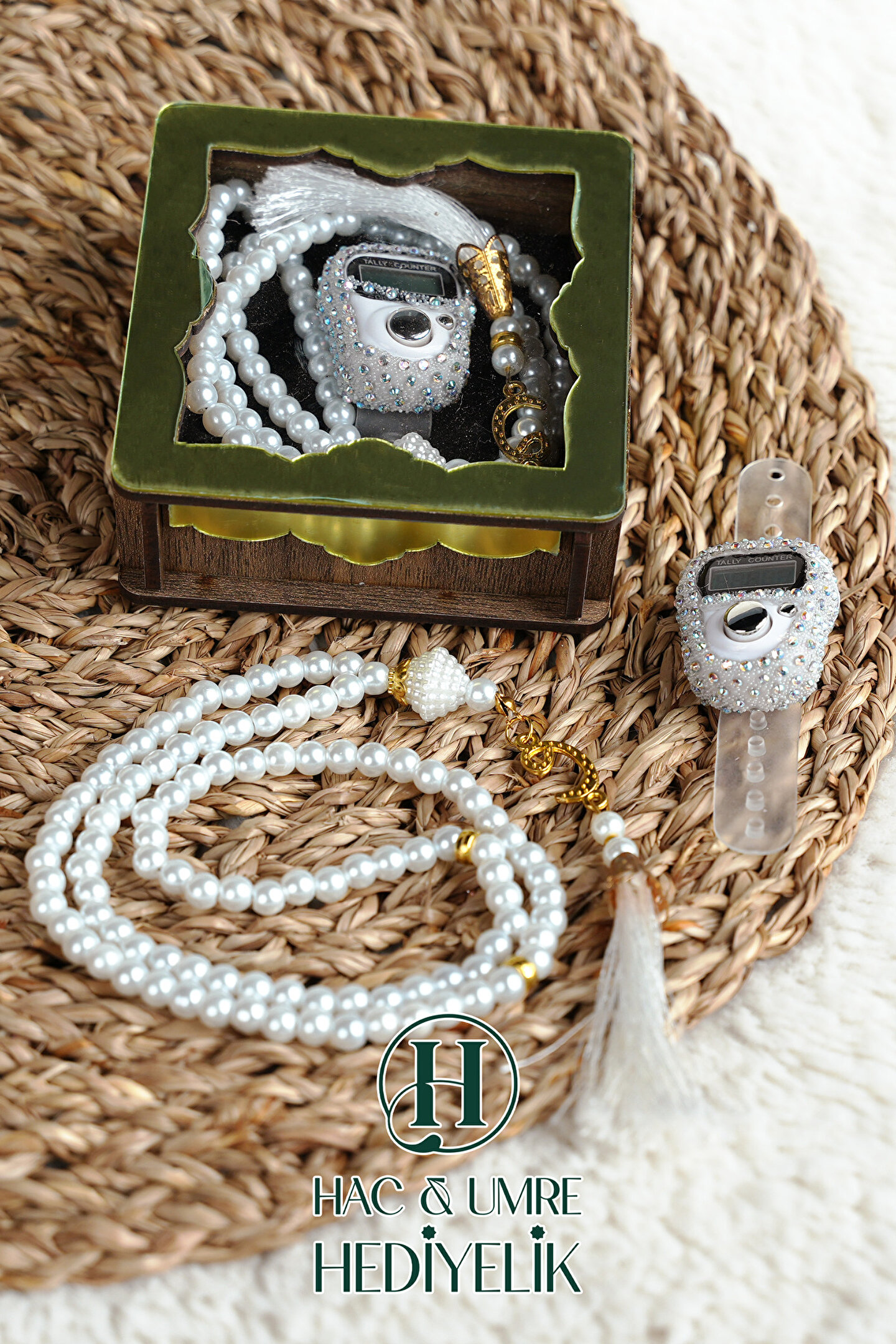 Hac Umre Hediyelik Hediyelik Tesbih Seti | Ahşap Kutulu Elektronik Tesbih ve 99lu İnci Tespih | Özel Gün Hediyesi