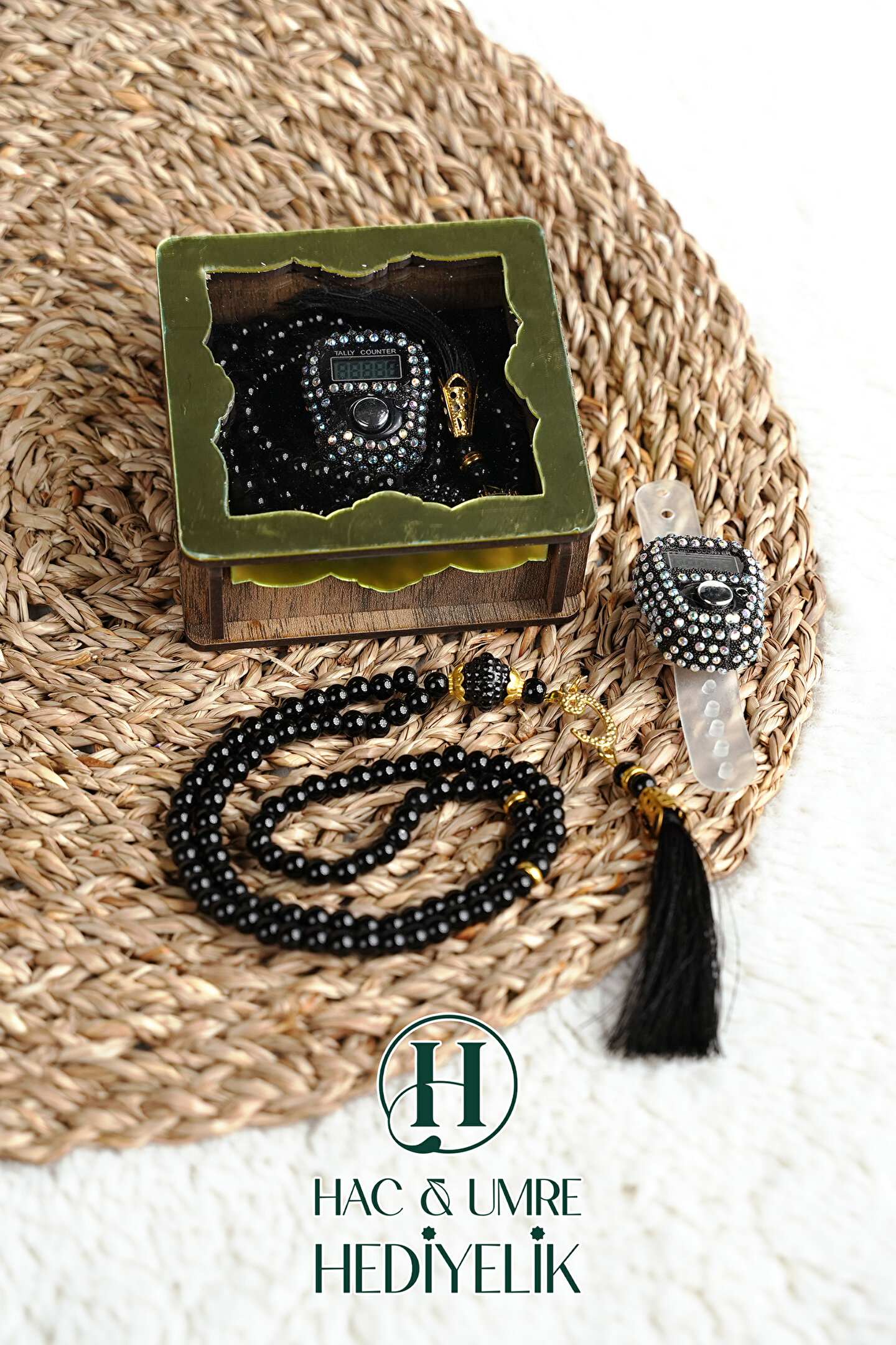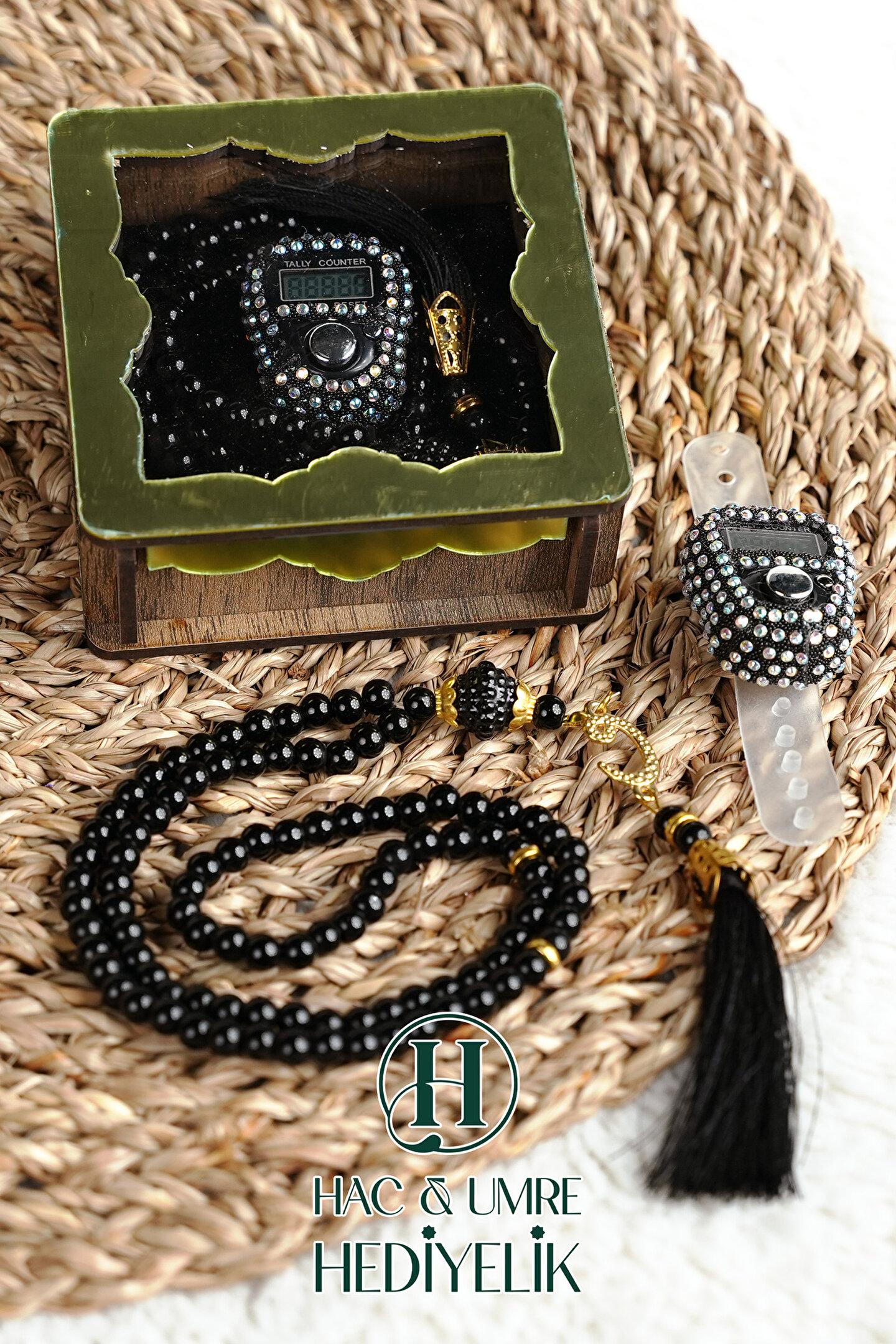 ✨ Lüks Taşlı Zikirmatik ve 99'lu Ahşap Kutulu Tesbih Seti ✨