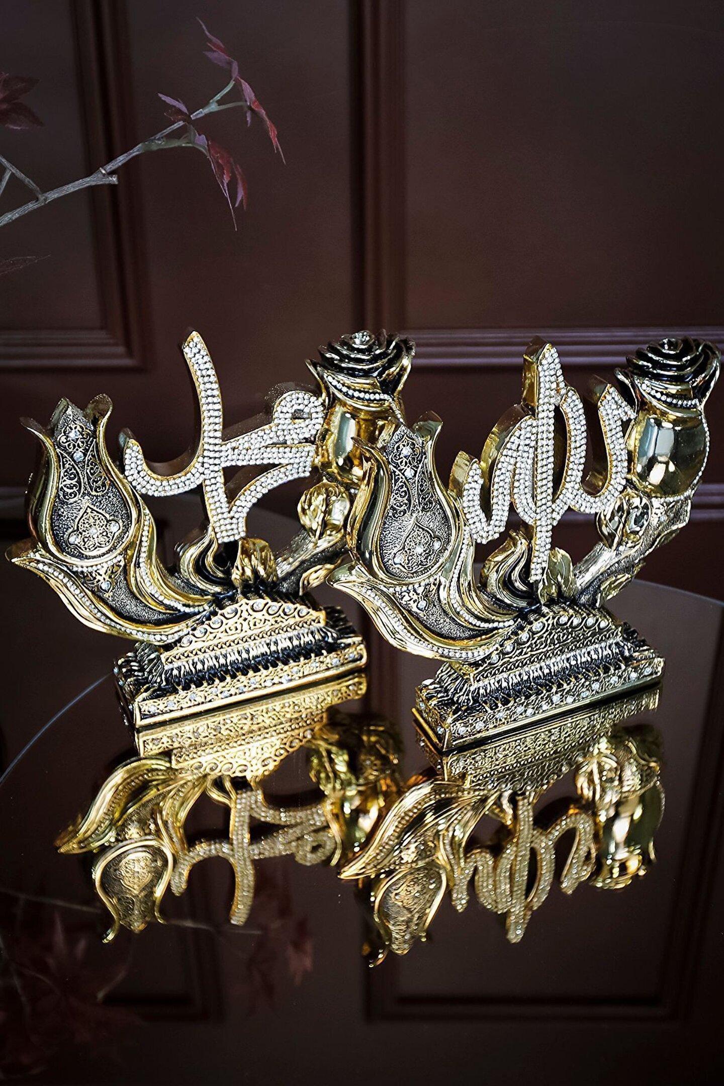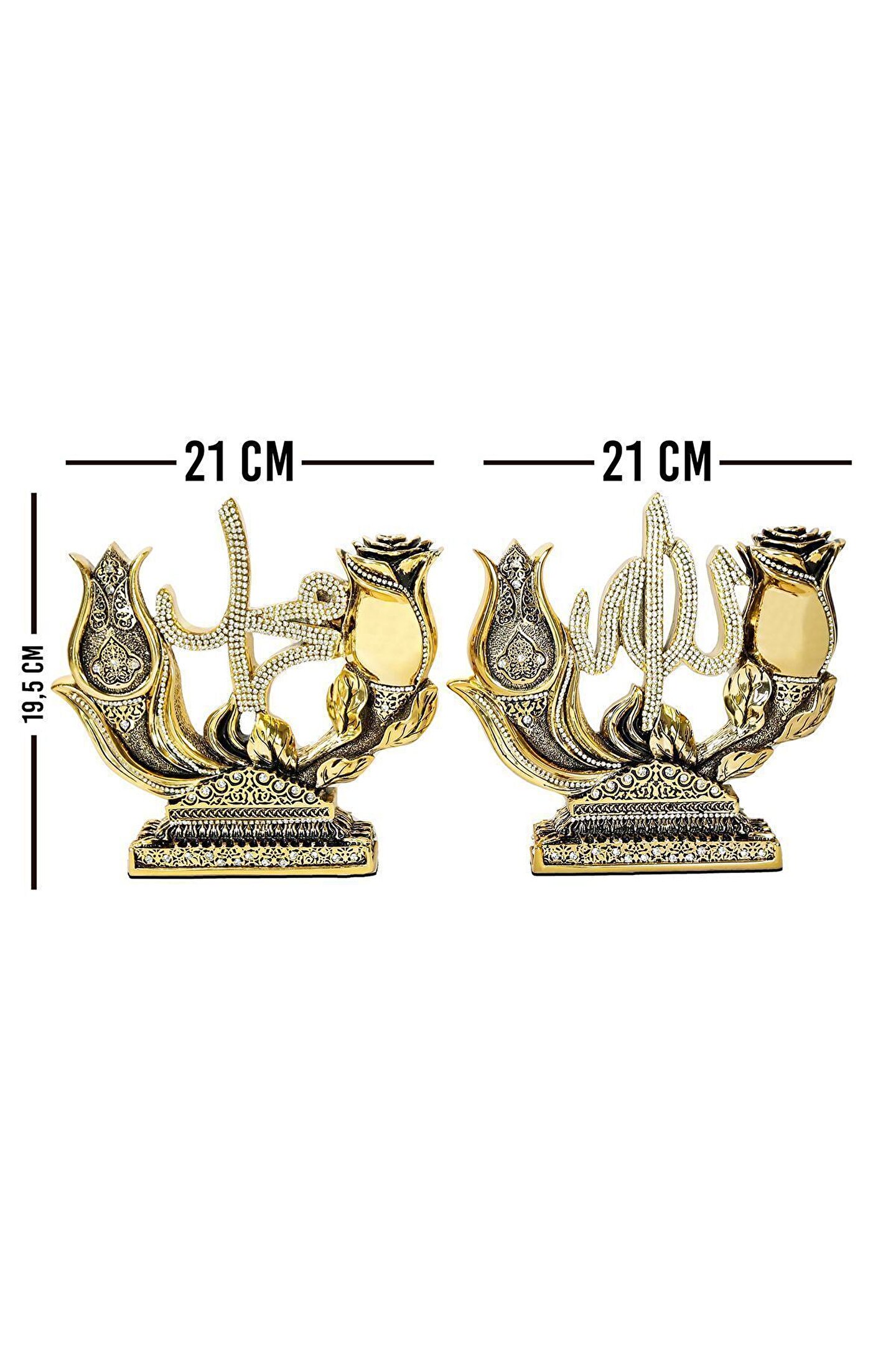 İki Lafız Çok Mana|Lale ve Gül Motifli Dekoratif Biblo ? Geleneksel Türk İslam Edebiyatı ve sanatlarının derin simgelerini taşıyan bu dekoratif biblo, lale ve gül motifleri aracılığıyla özel bir anlam yaratıyor. Lale, Allah'ı temsil ederken, gül ise peygamberimizi sembolize ediyor. İki parçadan oluşan bu zarif sanat eseri, geleneksel sembolizmimizi ve estetiği bir araya getiriyor. Lale ve Gül motiflerinin merkezinde yazılı Allah (c.c) ve Muhammed (s.a.s) lafızları, bu bibloyu sadece bir dekoratif obje olmaktan çıkarıp, aynı zamanda derin sevgi ve hasreti betimliyor. El işçiliğiyle özenle hazırlanan bu eser; evinizi, ofisinizi ya da sevdiklerinizin yaşam alanlarını güzellikle donatmanın ötesinde, mekan atmosferine derin bir anlam katıyor. Bu zarif eser sizin ve sevdiklerinizin yaşam alanlarına renk katmak için sizleri bekliyor... ? Hemen sipariş için ürün kodu: CN 106 ? Ürün Özellikleri: Orijinal Tasarım El Yapımı ve Yüksek Kaliteli Metalize Sert Polyester Malzeme Altın Kaplama 21x19,5 cm 860+765 gr El İşçiliği ? Kullanım Alanları: Yaşam alanlarına zarafet katmak için, Manevi bir hediye olarak, Dekoratif süs olarak, Anneye, Babaya, Eşe Hediye olarak, Yıldönümü, Doğum Günü, Terfi, Ev ve Ofis Hediyesi Olarak, Bereketin simgesi olması için, Maneviyatı hatırlatması için, Başarı ve sanatsal üretime ilham olması için, Kurumsal hediye ve diğer alanlarda kullanılabilir.