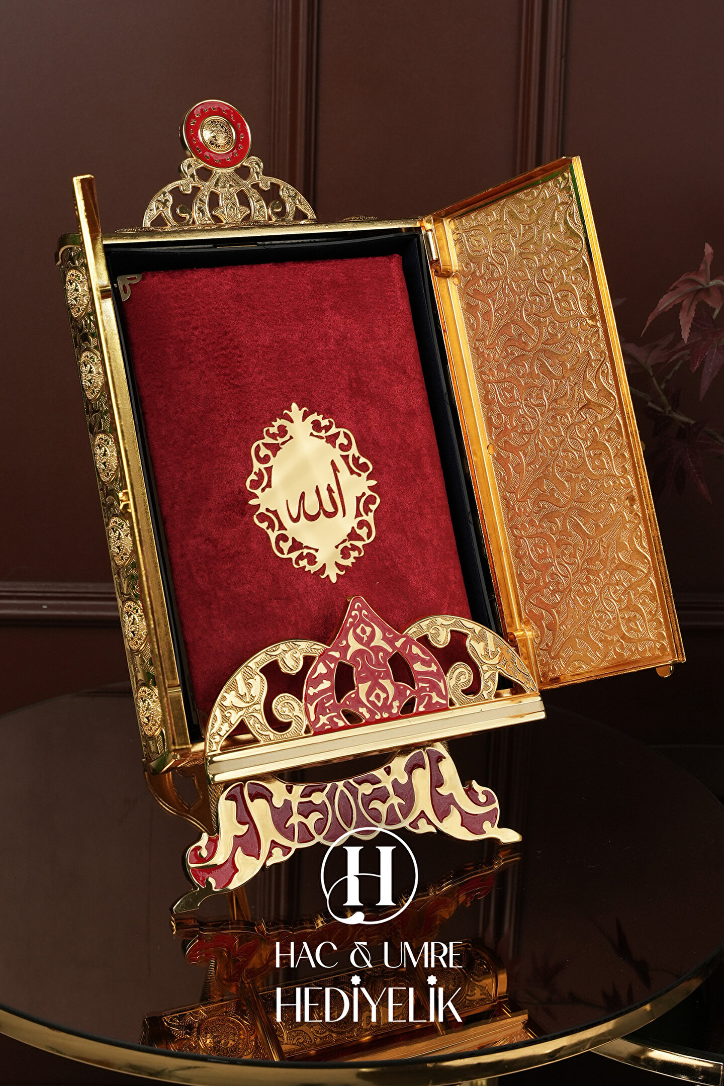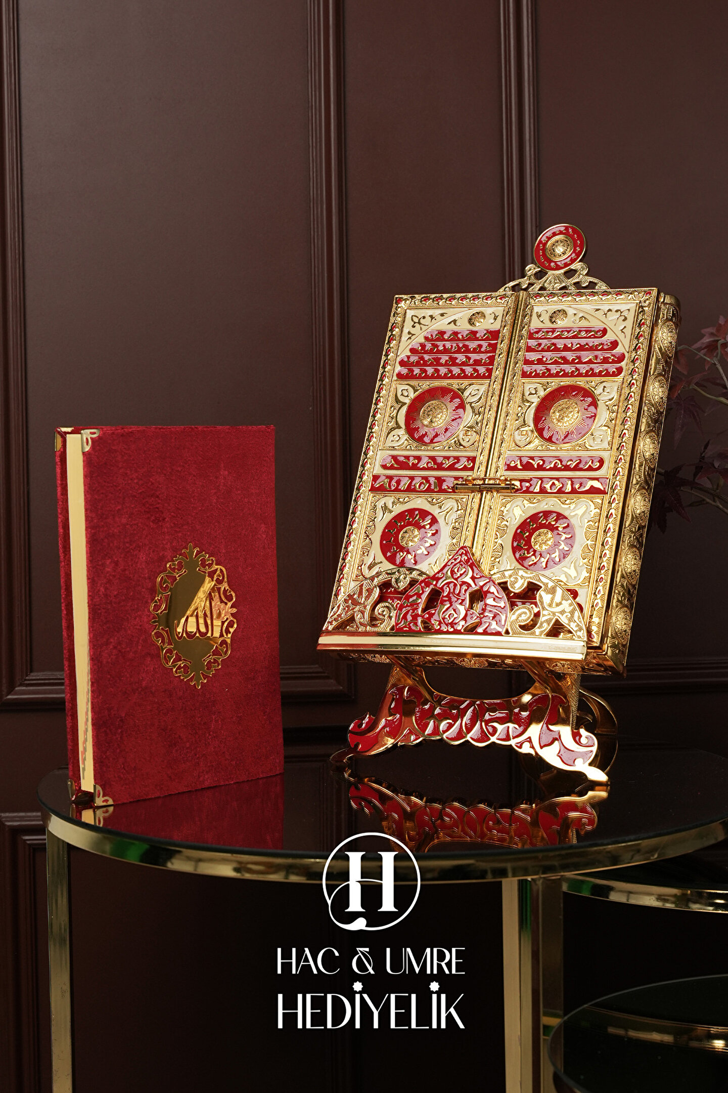 ✨ Kadife Kur’an-ı Kerim Seti | Altın Kırmızı Kutulu ve Standlı