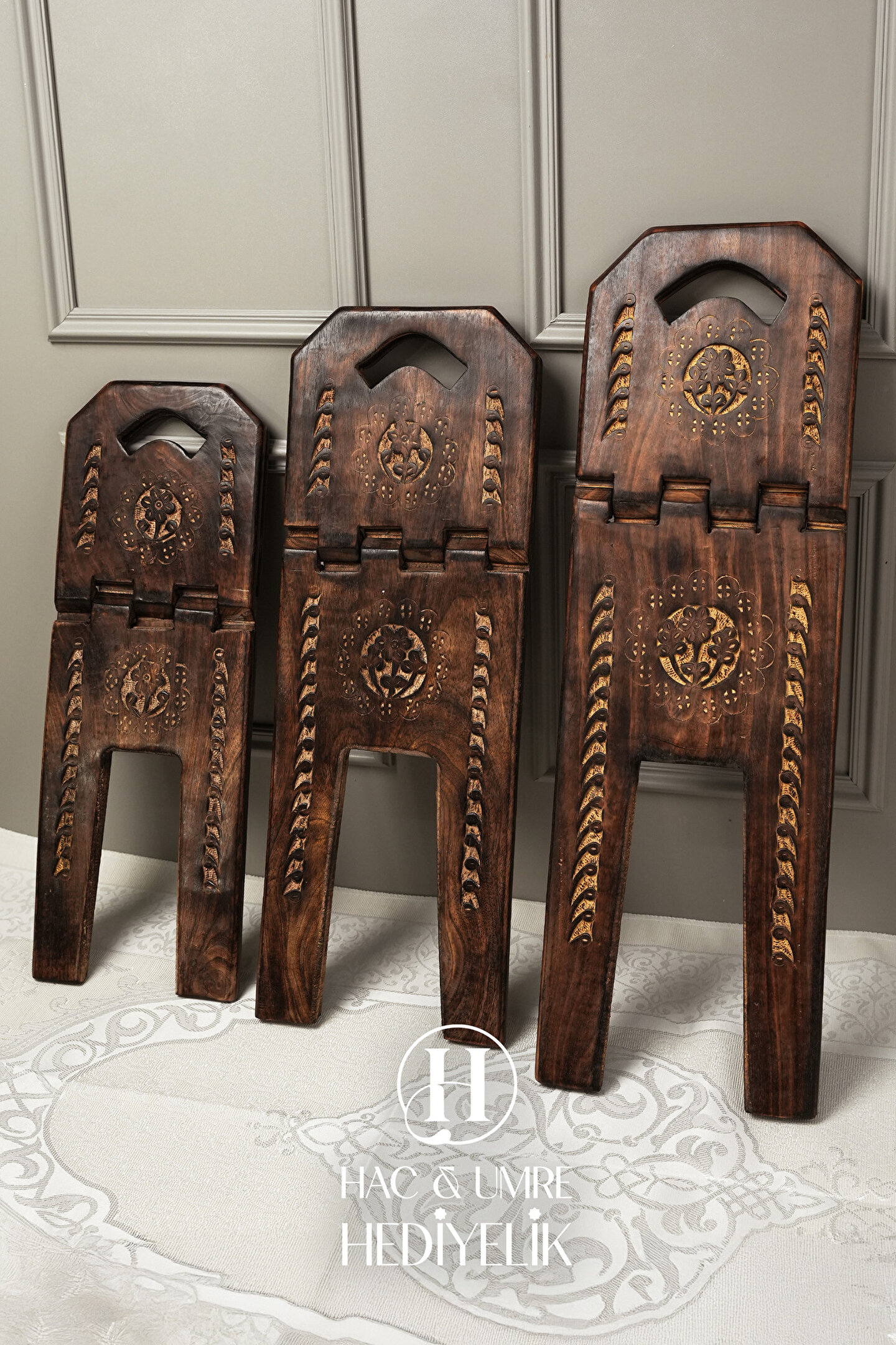 Hac Umre Hediyelik Rahle El Yapımı Masif Ahşap | Desenli Kulplu Kitap Okuma Standı | Küçük Boy Kuran Rahlesi