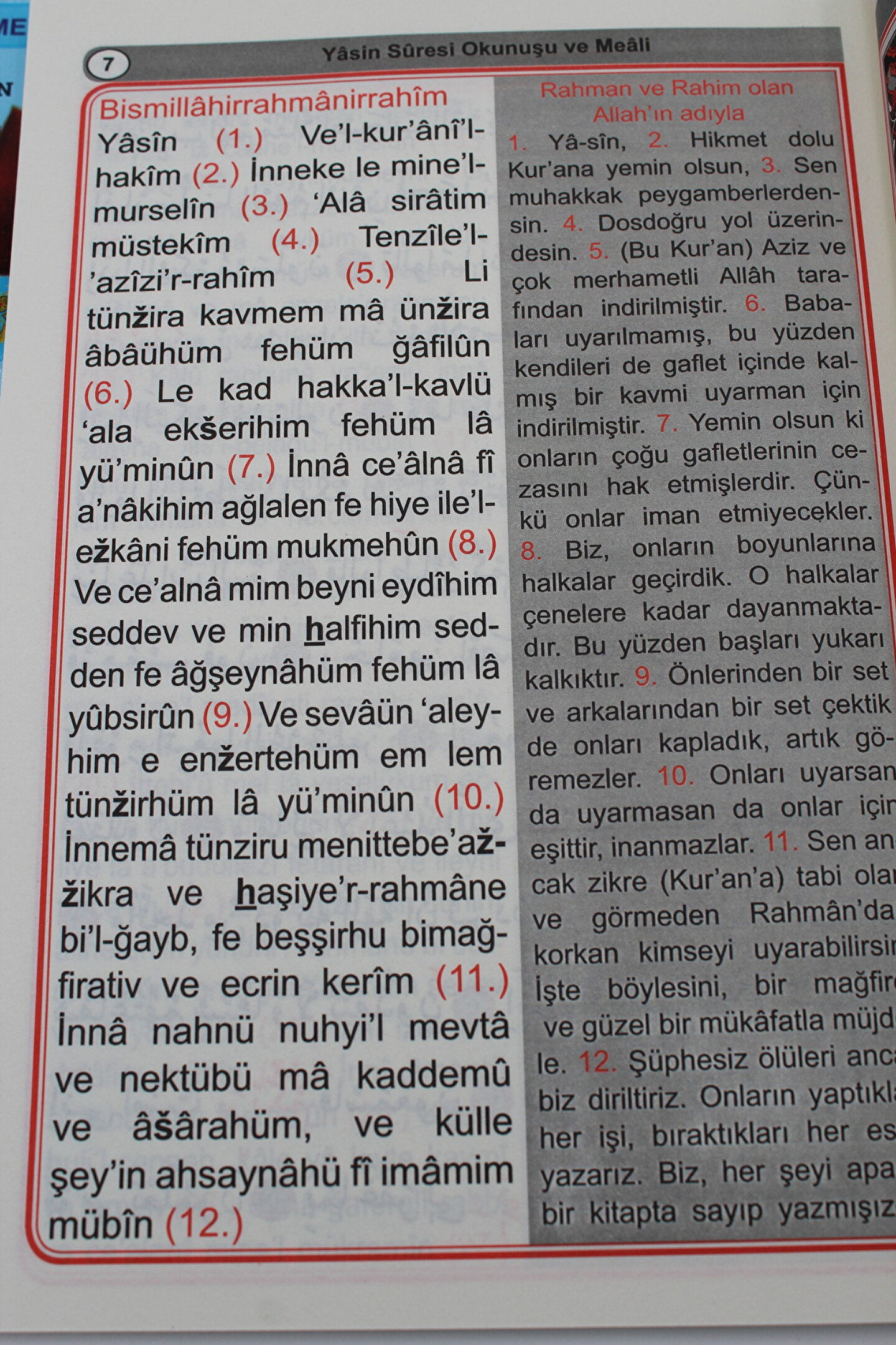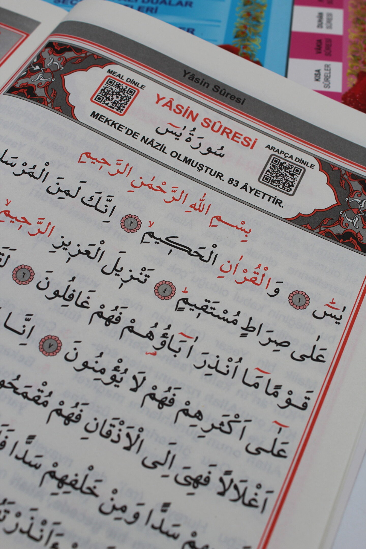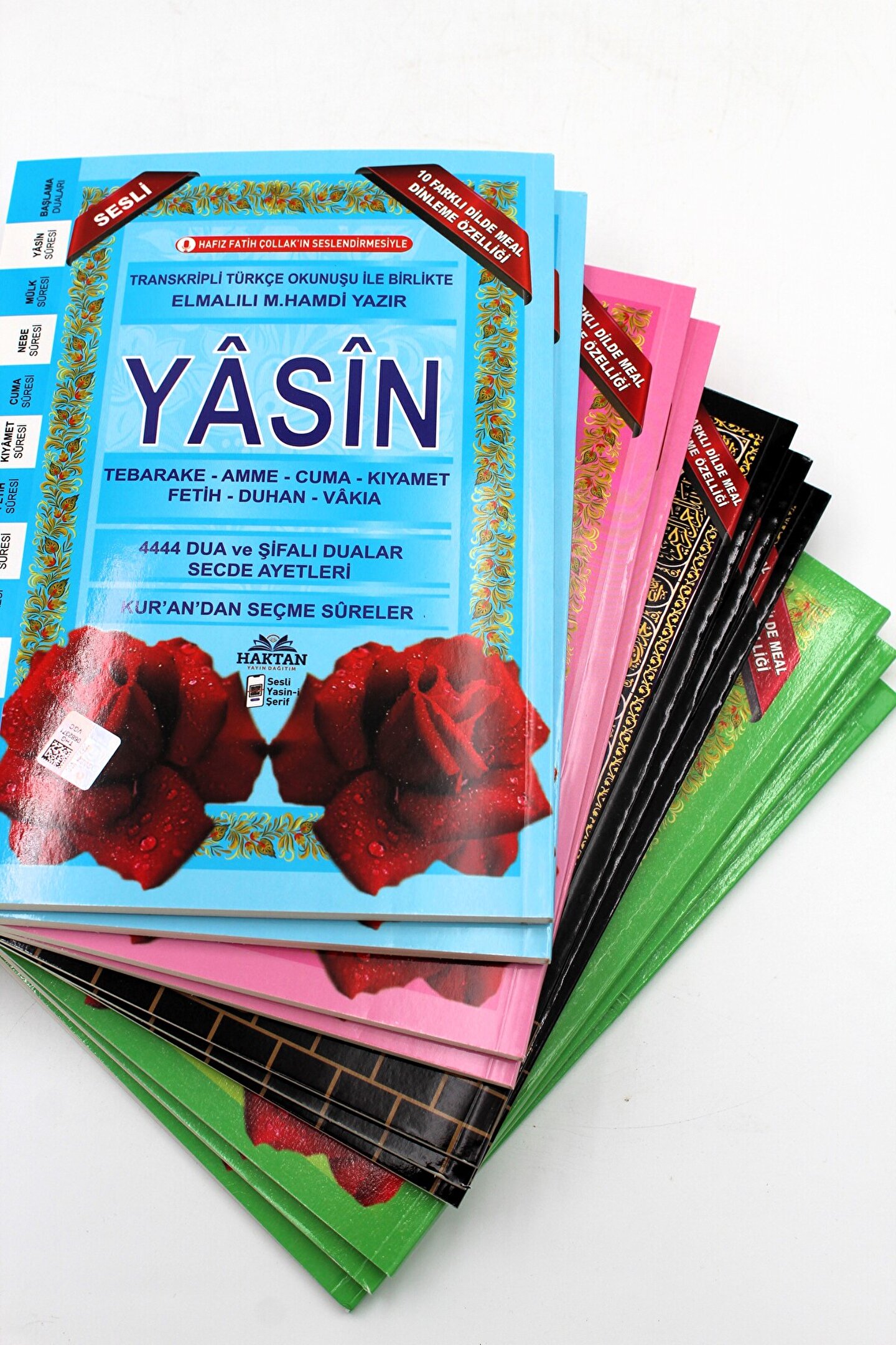 Yasini Şerif Açıklamalı ve Mealli Orta Boy Karışık Renk 10 Adet Ürün Özellikleri ; Boyut: 17x24cm ; 2. Hamur Kağıt ; Karton Kapak ; 80 Sayfa ; 2 Renk Baskı ; Diyanet Mühürlü ve Onaylıdır. ; Dünyanın en kolay okunan Bilgisayar Hattı ile hazırlandı, seçilen yazı hem estetik hem de harflerin temel karakterlerini koruyan ve kolay okunmalarını sağlayan özel bir hattır. Harekeler ait oldukları harflerin hemen altında ya da üstünde sıralanmış, özellikle okumaya yeni başlayanlar hareke karışıklıklarına meydan vermeyecek şekilde düzenlenmiştir. ;