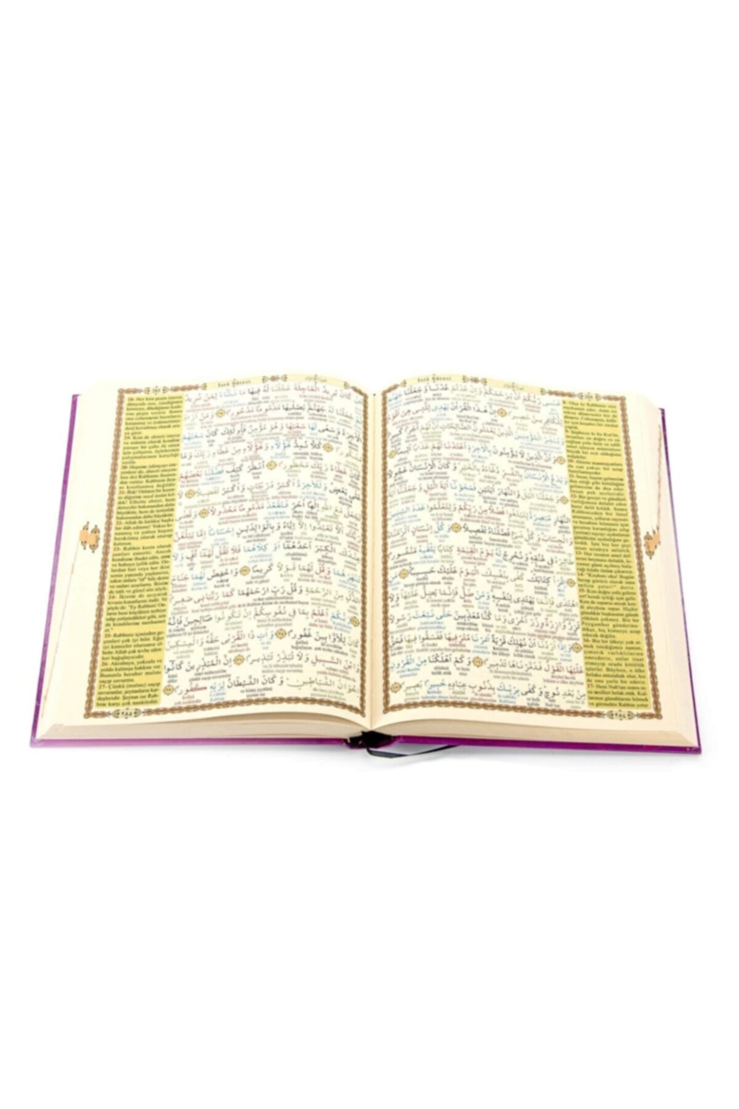 Eser Özellikleri: Meal: Elmalılı Muhammed Hamdi Yazır Kelime Meali: Mahmut Tosun, Fahri Altunkaynak, Abdullah Sarıkaya Sayfa Sayısı: 624 Ebat: 25 x 34 cm Basım Tarihi: 2014 Basım Yeri: Konya Kapak Türü: Ciltli Sert Kapak Kağıt Türü: Şamua Kağıt Dili: Arapça - Türkçe Yayınevi: Haktan Yayın Dağıtım 5 Özellikli: Arapça Hat Satır Arası Kelime Meali Türkçe Transkriptli Meal Tecvidli Okunuş Her İnsan Kuran Okumayı Öğrenebilir... Günümüz teknolojisi bu konu da insanların hizmetine bir çok ürünler sunmaktadır. İnteraktif CD ler, İnternet,Kasetler, Elif ba kitapçıkları gibi çok çeşitli imkanlar vardır. Herşeye Rağmen Kuran-ı Arapçasından okuyamayanlar için hazrılanmış olan bu eserde, her kelimenin altında gösterilen transkripsiyon işaretlerine riayet edildiği zaman daha az yanlışsız okunacaktır.. ÖNSÖZ Rahman ve Rahim olan Allah’ın adıyla... Allah’a hamd olsun. O’nun Peygamberine, al ve ashabına selam olsun. Bu yolda değerli çalışmaları ile hizmetimizi kolaylaştıran âlimlerimize, hocalarımıza Rabbimiz rahmet etsin. Kutsal kitabımız Kur’an-ı Kerimi okuma, anlama ve insanlığa sunduğu mesajları kavrayıp yorumlama ile ilgili bugüne kadar birçok çalışma yapılmıştır. Yapılan bu çalışma da bunlardan biridir. Bu çalışma, kulluk kitabımız Kur’an-ı Kerim’i doğru bir şekilde Arapçasından okuma, her şeye rağmen okuyamayanlar için Türkçesinden okuma amaçlı hazırlanmıştır. Kısacası, biz bu çalışmayla herkesi Kur’an’la buluşturmayı hedefledik. MUHTEVA Kapsamlı bir çalışma sonucu hazırlanan bu Kur’an-ı Kerimde; Arapça Hat, Türkçe okunuş, Bu çalışmanın en bariz özelliği, okuyucuyu Arapça Hat, Türkçe okunuş ile bire bir yüzyüze getirmesidir. HATIRLATMA: Asıl olan Kur’an’ı Arapçasından okumaktır. Her şeye rağmen Arapçasından okuyamayanlar için her kelimenin altında gösterilen Transkriptsiyon işaretlerine uyulduğu takdirde daha az yanlışsız okunacağını hatırlatırız. Çalışmamızı yaparken büyük bir titizlik göstererek hataları asgariye indirmeye gayret ettik. Buna rağmen ehil olanların yapacakları tenkitler, eksikliklerimizin giderilmesinde bizlere yol göstereceğini ve bunun için onlara duacı olacağımızı ifade etmek isteriz. Çalışmak bizden başarı ise Allah’tandır.;