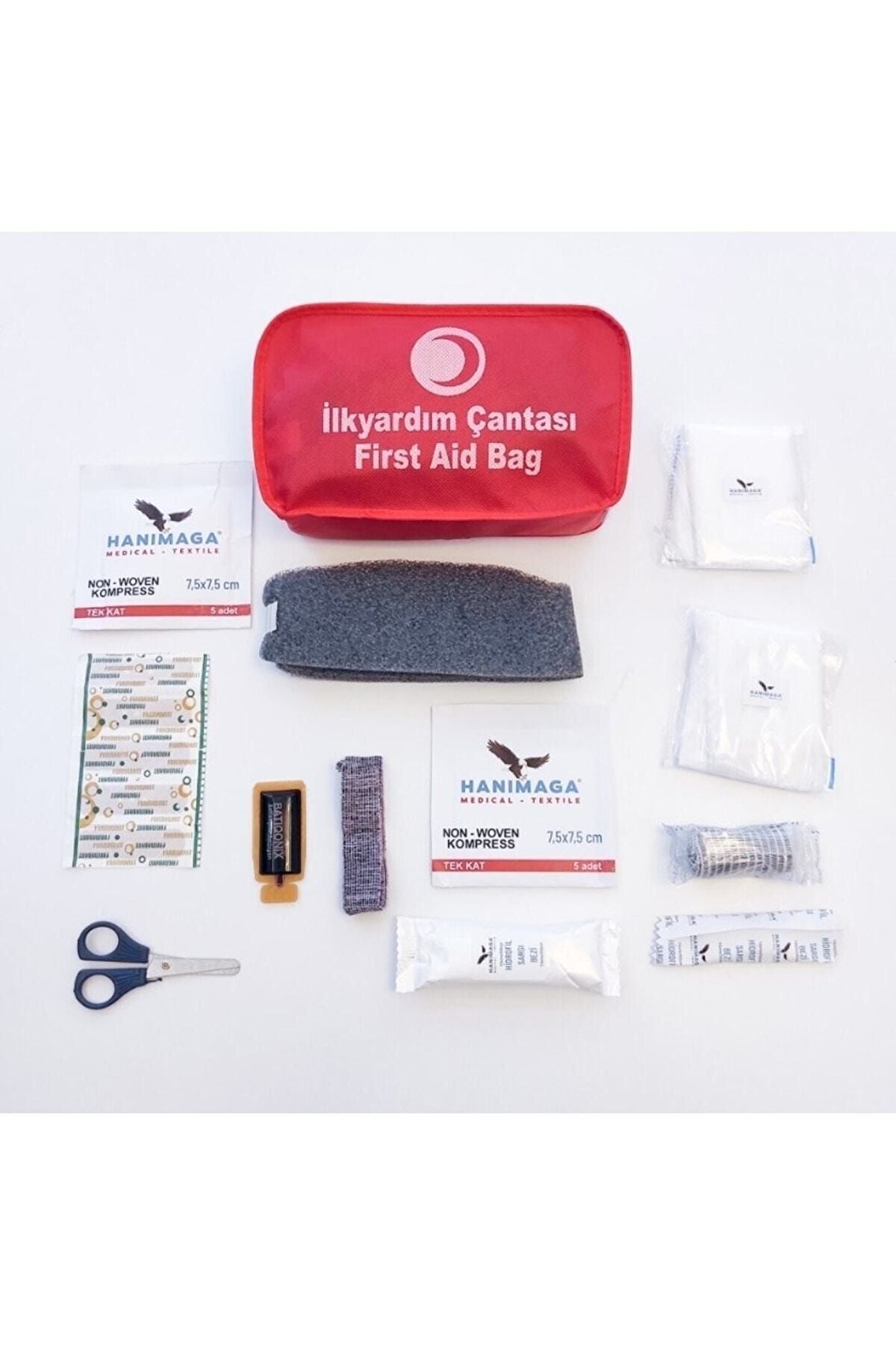 ÜRÜN İÇERİĞİ: 1 ADET BOYUNLUK; 5 ADET 5CMX5CM 8 KAT GAZLI BEZ; 1 ADET MAKAS; 5 ADET YARA BANTI; 1ADET BATİQONIX 50CC; 1 ADET SARGI BEZİ; 1 ADET LASTİK BANTI; 1 ADET 10CMX150CM SARGI BEZİ; 2 ADET ÜÇGEN SARGI BEZİ; 1 PAKET PAMUK;