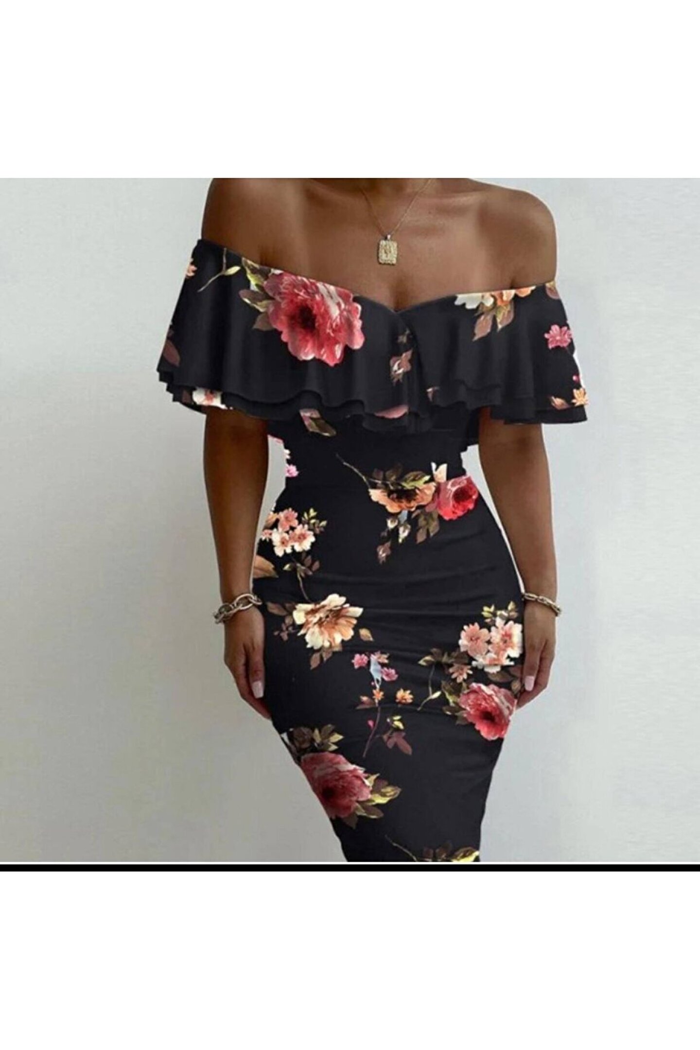 HanZone Kadın Madonna Yaka çiçek Baskılı Volan Detay Kalem Elbise