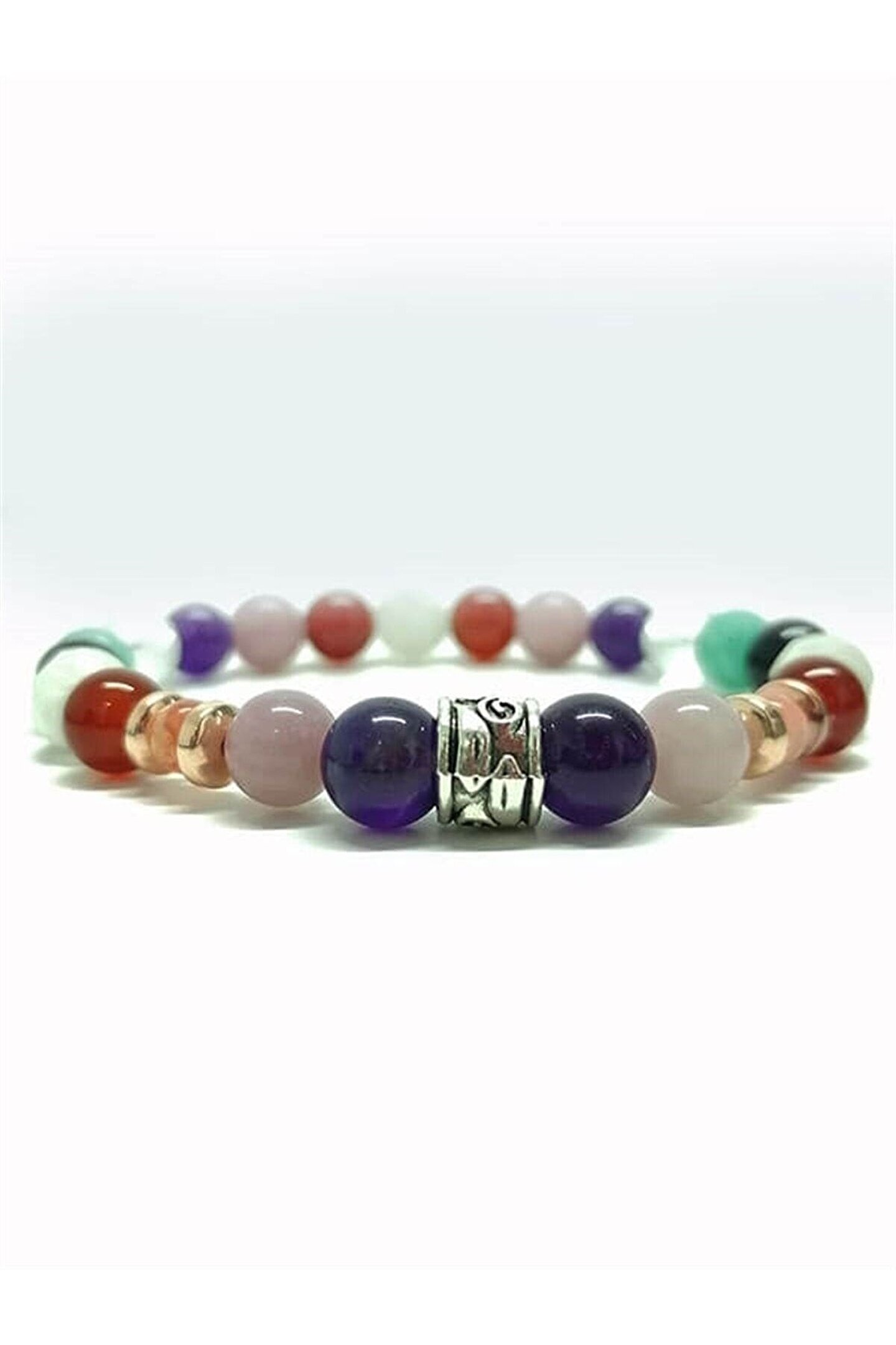 - Doğal taşların eşsiz güzelliğini yansıtan bu bileklik, her kıyafetle uyum sağlayacak şık bir aksesuar seçeneği sunar; - Ametist, pembe kuvars, akik, ay taşı ve kristal kuvars gibi farklı türdeki doğal taşların birleşimiyle zenginleştirilmiş bu bileklik, benzersiz bir dokunuş katıyor; - 8 mm boyutundaki bu bileklik, hem günlük kullanım hem de özel günler için ideal bir aksesuar olarak öne çıkıyor; - Doğal taş materyali sayesinde her bileklik, her bir parça benzersiz ve özgün bir görünüm sergiliyor;