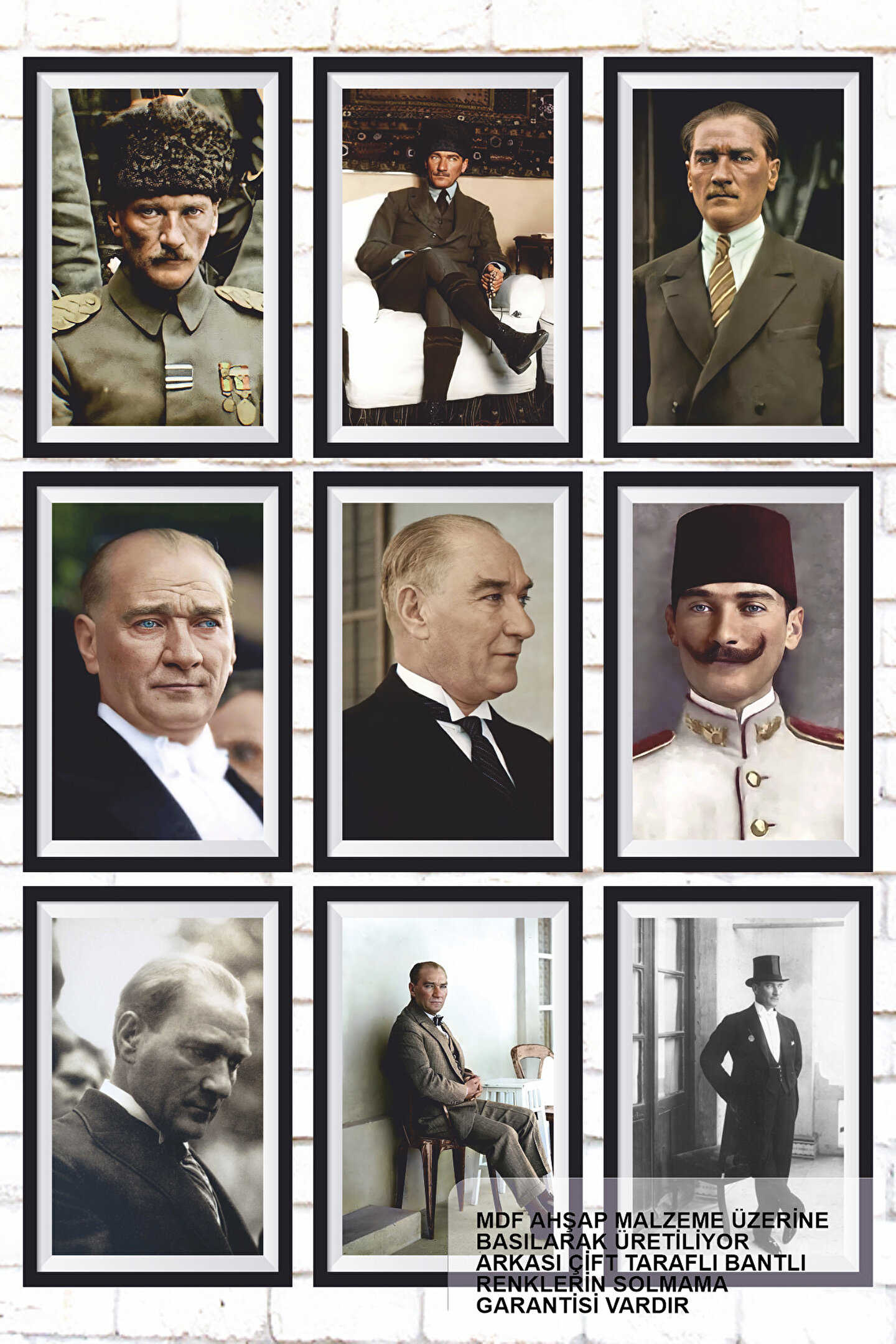 - Retro tarzıyla dikkat çeken bu 9 parça ahşap tablo seti, Mustafa Kemal Atatürk'ün özgün portrelerini modern bir dokunuşla sunar.; - Çerçevesiz tasarımı sayesinde duvarlarınıza kolayca uyum sağlar ve mekanınıza şık bir atmosfer katar.; - Her bir parçası 9 adet olmak üzere toplamda 9 farklı eseri barındırır; her biri ayrıntılı ve estetik açıdan zenginleştirilmiş detaylara sahiptir.; - Dayanıklı MDF malzemeden üretilmiştir, uzun ömürlü kullanım vaat ederken aynı zamanda çevre dostu bir seçimdir.; - Yurt içinde üretilmiş olmasıyla yerel sanatçıların yeteneklerini yansıtan bu set, Türk kültürünün değerli bir parçasını evinizde sergilemenize olanak tanır.