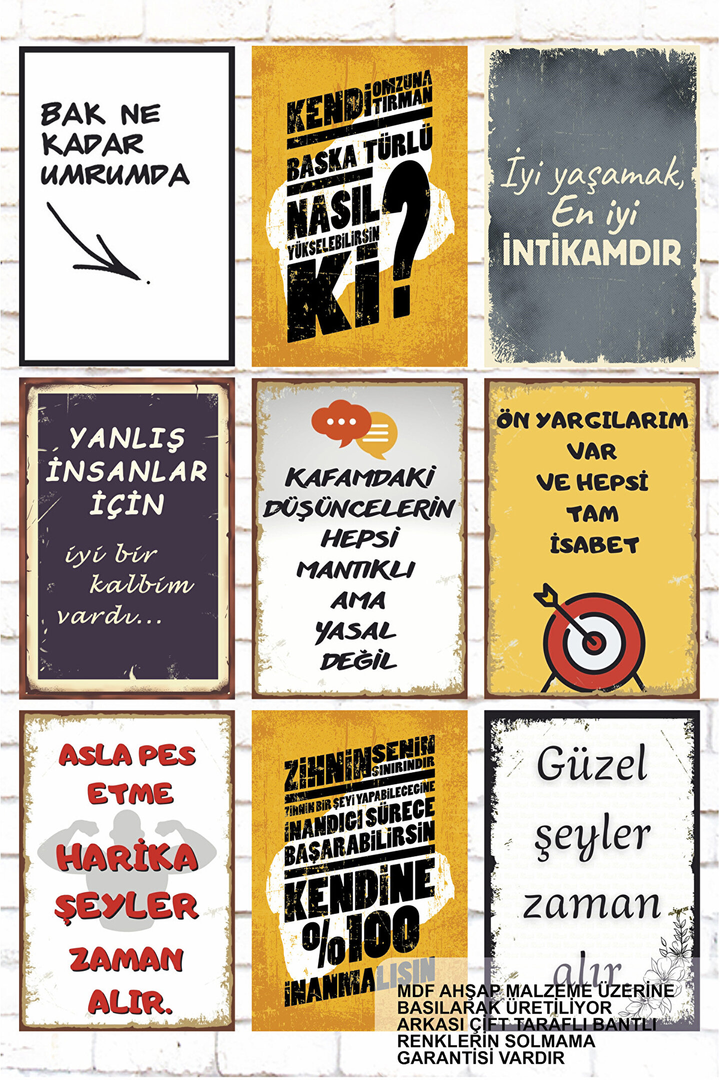 Eşsiz bir tarz arayışında mısınız? Retro Ahşap Posterler, size nostaljik bir atmosfer sunuyor! Bu etkileyici posterler, e-ticaret sitemizde sizleri bekliyor.; Retro ahşap posterlerimiz, yüksek kaliteli 3 mm MDF malzemesi üzerine yüksek teknolojiyle baskı yapılarak üretilmektedir.; Bu sayede detayları zenginleştirerek görselleri canlandırıyoruz.; Her bir poster, benzersiz bir nostaljik atmosfer yaratmak için özenle tasarlanmıştır.; Bu posterler, duvarlarınıza ve yaşam alanlarınıza anında bir karakter katmak için mükemmel bir seçenektir.; Evlerinizi, ofislerinizi, kafelerinizi veya herhangi bir mekanı retro bir cazibeyle dönüştürebilirsiniz.; İster kendi koleksiyonunuzu oluşturun, ister sevdiklerinize özel bir hediye verin, bu posterler her zaman ilgi çekici bir seçimdir.; E-ticaret sitemizde, çeşitli retro temalara sahip farklı poster seçenekleri bulabilirsiniz.; Müzik, film, seyahat veya vintage reklamlar gibi çeşitli konular arasından tarzınıza uygun olanı seçebilirsiniz.; Baskı kalitesi ve detaylara verdiğimiz özenle her bir poster, gerçek bir sanat eseri niteliği taşır.; Retro Ahşap Posterlerimiz, dayanıklılığı ve estetiği bir araya getiren mükemmel bir kombinasyondur.; Yüksek teknolojili baskı teknikleri sayesinde posterlerimiz, uzun ömürlü ve canlı renklere sahiptir.; Bu sayede yıllarca kullanabilir ve her zaman büyüleyici bir görüntüye sahip olabilirsiniz.; Hemen e-ticaret sitemize göz atın ve kendi retro ahşap posterlerinizle zaman yolculuğuna çıkın.; Eşsiz bir tarz yaratmanın keyfini çıkarın ve yaşam alanlarınızı retro bir atmosferle dönüştürün!" - Çerçevesiz tasarımı ile kolayca duvara asılabilir ve mekanınıza modern bir dokunuş katar.; - Türkiye'de üretilmiş olup, yerel malzemelerle dayanıklılık ve kalite sunar.; - İlham verici sözleriyle motivasyonunuzu artırır ve günlük yaşamınıza pozitif enerji katmanıza yardımcı olur.; - Yüksek kaliteli MDF materyali sayesinde uzun ömürlü kullanım vaat eder.; - 9 parça set halinde gelir; farklı alanlarda veya kişisel zevkinize göre düzenleyebilirsiniz.