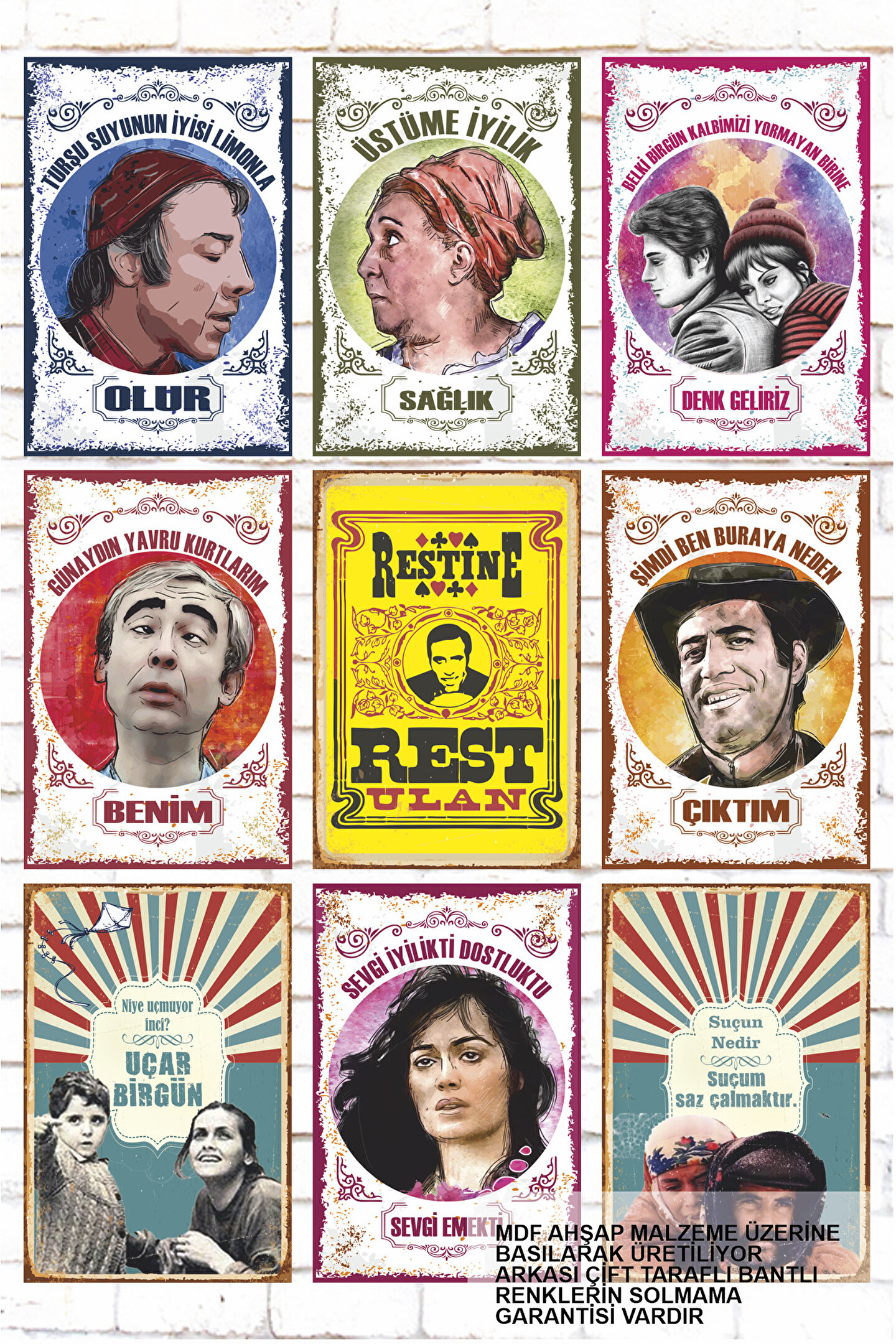 - Yeşilçam Türk Sineması'nın klasik filmlerini ve ünlü oyuncularını yansıtan 9 parçalık ahşap tablo seti, retro tarzıyla dikkat çeker.- Çerçevesiz tasarımı sayesinde duvarlarınızda kolayca asılabilir ve mekanınıza modern bir dokunuş ekler.- Yüksek kaliteli MDF materyalden üretilmiş olup uzun ömürlü kullanım sunar.- Her bir parça, farklı bir film veya oyuncuyu temsil ederek koleksiyonunuzu zenginleştirir.