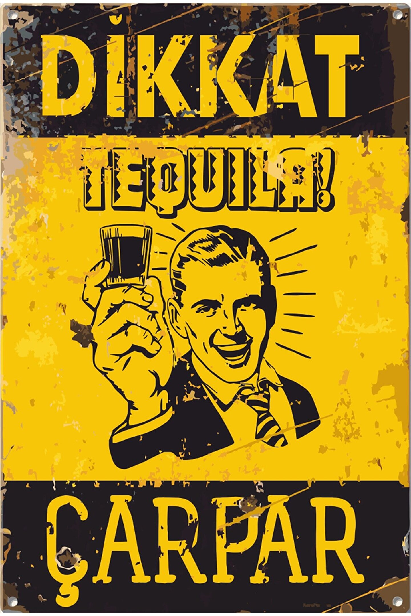 Retro tasarımıyla dikkat çeken tekila alkol çarpması uyarı levhası, evinizin veya ofisinizin dekorasyonuna nostaljik bir dokunuş katıyor; Dayanıklı ahşap malzemesi sayesinde uzun ömürlü kullanım sunar ve kolayca temizlenebilir; Tek parça halinde gelen bu tablo, montaj gerektirmeyen pratik bir kullanım sağlar;