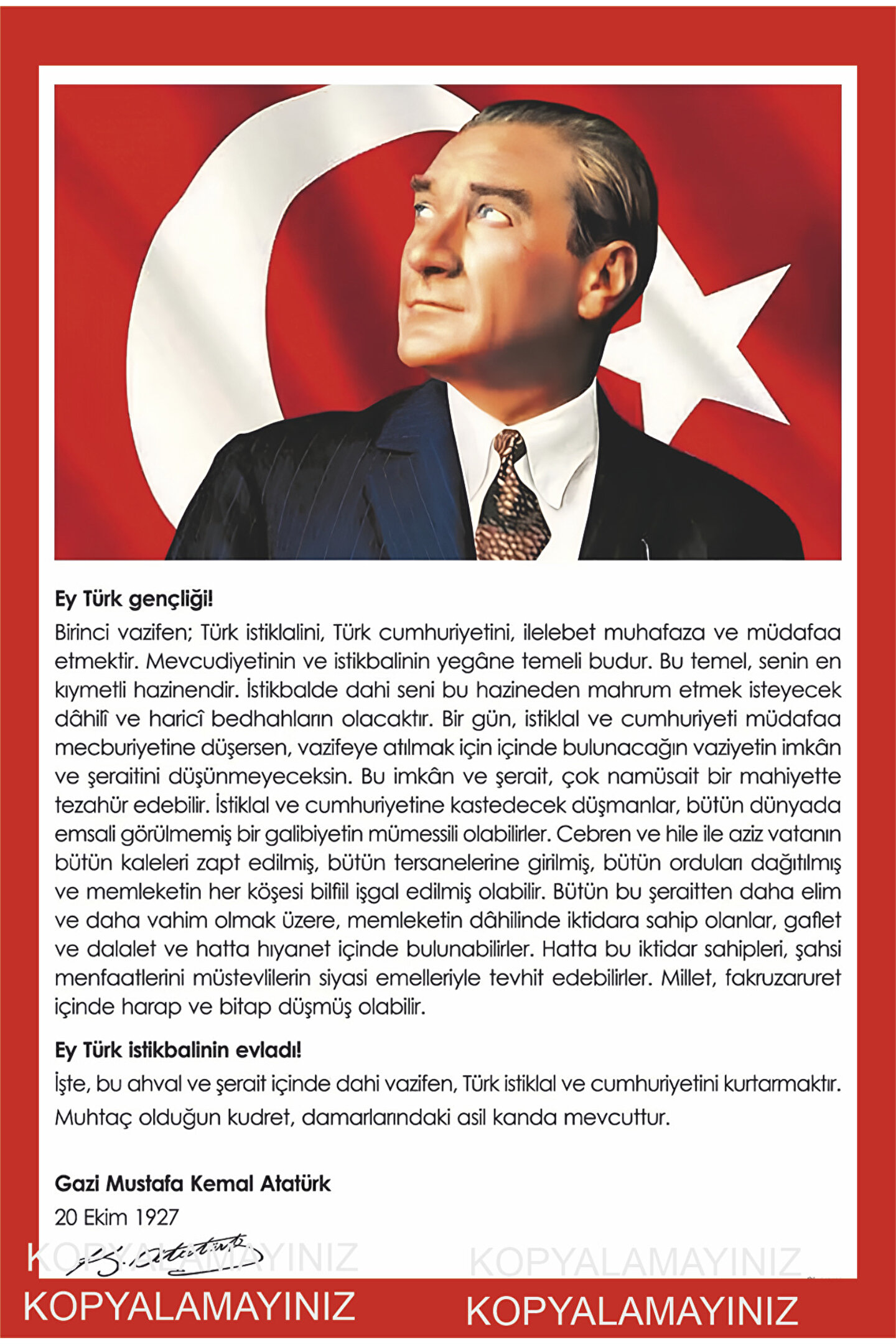 - Atatürk'ün gençliğe hitabesi, genç odanızın duvarlarını süsleyen bu tablo ile gençliğinizin ruhunu yansıtır.; - MDF malzemesi kullanılarak üretilen bu poster, dayanıklılığı ve uzun ömürlü kullanımı garanti eder.; - Tek parça halinde gelen bu ürün, montaj gerektirmeyen pratik bir kullanım sunar.; - Çerçevesiz tasarımı sayesinde farklı çerçevelerle kolayca uyum sağlar ve kişisel tarzınıza göre özelleştirilebilir.; - Retro temalı tasarımıyla nostaljik bir atmosfer yaratırken, genç odanızın dekorasyonuna modern bir dokunuş katar.; mdf ahşap üzerine baskı 20x30 cm çift taraflı bantlı