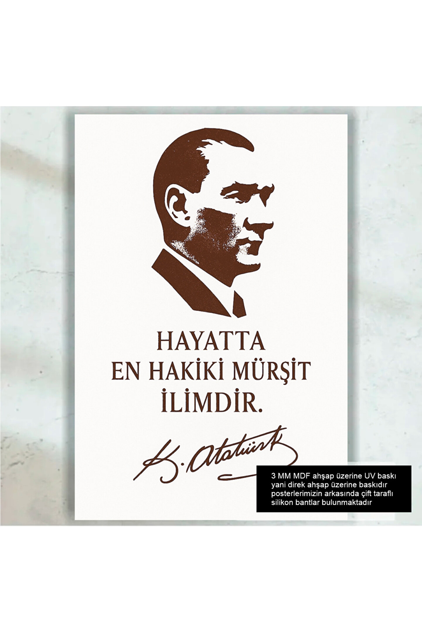 - Mustafa Kemal Atatürk'ün derin felsefesini yansıtan bu retro ahşap poster tablo, evinizin veya ofisinizin duvarlarına derinlik katıyor.; - Tek parça halinde sunulan bu ürün, kolay montaj avantajı sunarak zaman kazandırıyor.; - Retro tasarımı ile modern ve klasik dekorasyon stilleriyle uyumlu bir görünüm sağlıyor.; - MDF materyali sayesinde dayanıklılığı artırılmış ve uzun ömürlü kullanım vaat ediyor.; - Çerçevesiz yapısı ile minimalist estetiği benimseyenler için ideal bir seçim; duvarlarınızda temiz ve sade bir izlenim bırakıyor.