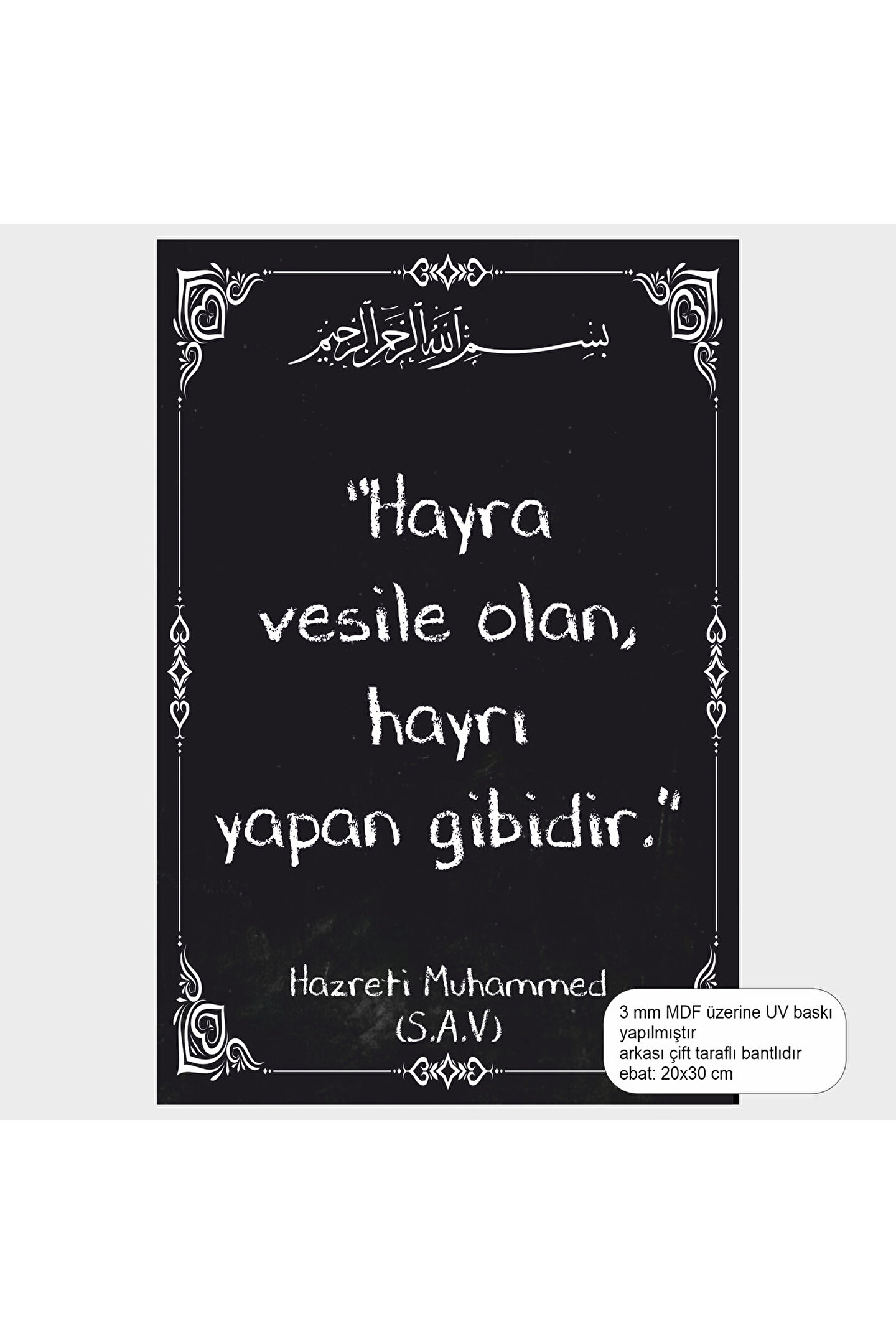 Hayra vesile olan hayrı yapan gibidir.; Hz.; Muhammed Hadisleri islami dini tablo ahşap poster 20x30 cm 3 mm MDF üzerine baskı arkası çift taraflı bantlı Manevi ve dini temalı tasarımıyla, İslam'ın güzelliklerini yansıtan bir duvar dekorasyonu sunar.; - Hz.; Muhammed Hadisleri'nin anlamını ve önemini vurgulayan bu tablo, evinizin veya ofisinizin atmosferini zenginleştirir.; - Türkiye menşeli olup, yerel üretimle kaliteyi ve özgünlüğü bir arada sunar.; - Çerçevesiz tasarımı sayesinde, kişisel zevkinize göre çerçeve seçme özgürlüğü sağlar ve farklı dekorasyon stilleriyle uyum içinde olmasını kolaylaştırır.; - MDF materyali ile dayanıklılık ve uzun ömürlü kullanım vaat eder; yıllar boyu ilk günkü canlılığını korur.;