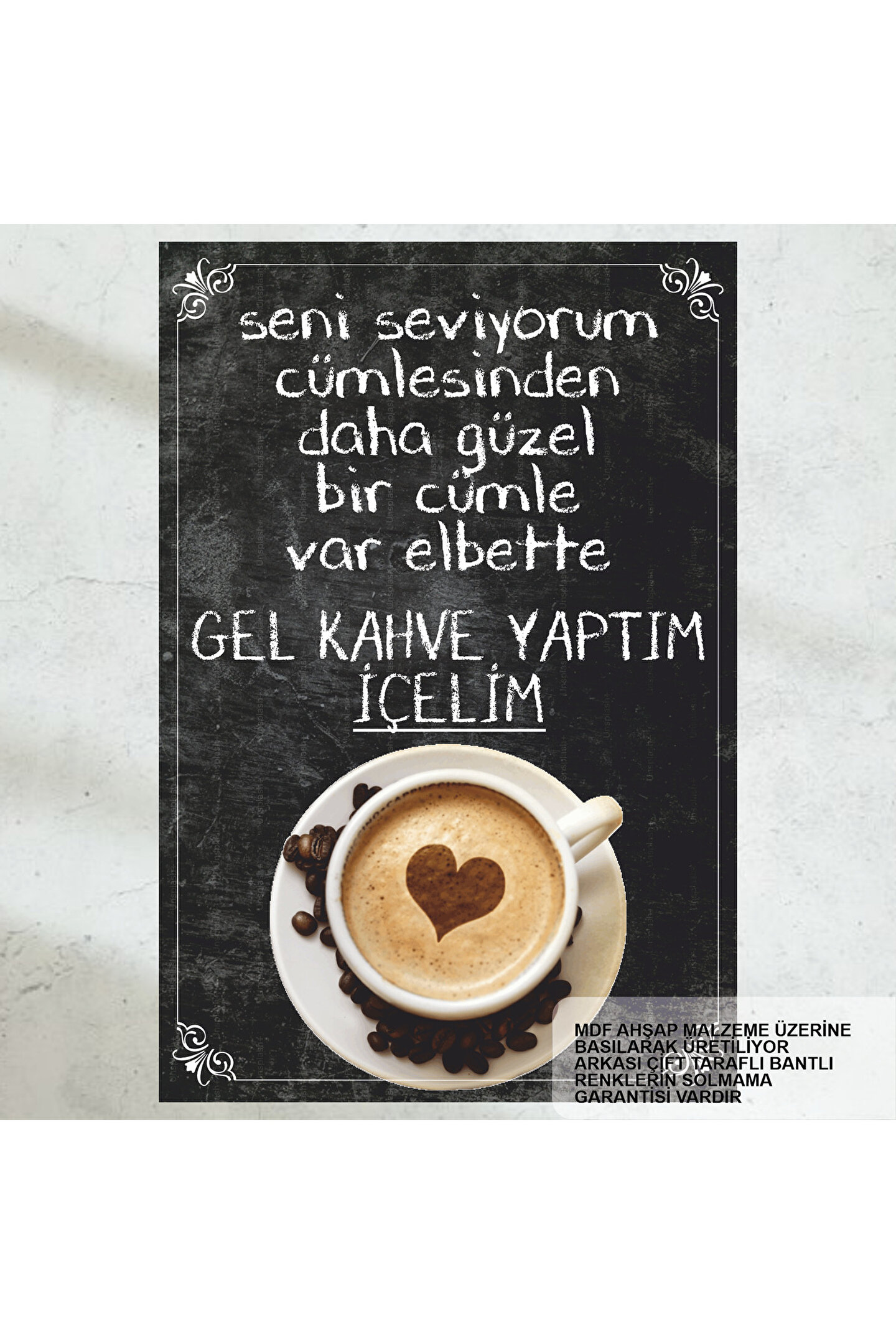 - Retro tasarımıyla dikkat çeken bu duvar yazısı, kahve keyfinizi daha da özel kılar.; - Ahşap malzemesiyle doğal bir dokunuş sunan bu ürün, mekanınıza sıcaklık katmak için idealdir.; - Tek parça halinde gelen bu çerçeve tipi, kolay montaj avantajı sağlar ve ekstra zaman kazandırır.; - Ev, mutfak veya kafe gibi farklı alanlarda rahatlıkla kullanabileceğiniz retro stil, dekorasyonunuzu tamamlar.; - Türkiye'de üretilen bu ürün, yerel kaynaklı malzemelerle sürdürülebilirliği desteklerken kalite standartlarından ödün vermez.