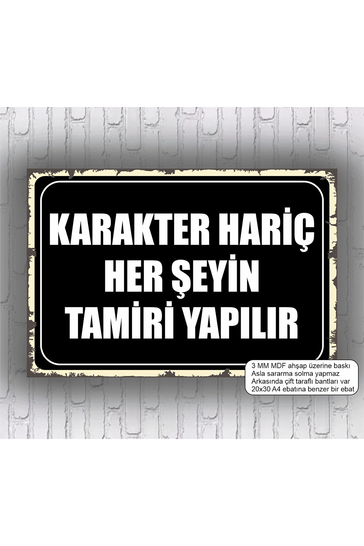 - Mizah severler için ideal bir dekorasyon ürünüdür; "karakter hariç her şeyin tamiri yapılır" esprili sloganıyla dikkat çeker.; - Retro tarzıyla evinizin veya ofisinizin atmosferini canlandırır ve mizah dolu anların vazgeçilmez bir parçası haline gelir.; - Türkiye'de üretilen bu ürün, yerli malı destekleyen bir tercih sunar.; - Çerçevesiz tasarımı sayesinde, istediğiniz çerçeve ile kolayca uyum sağlar ve kişisel zevkinize göre şekillendirme imkanı tanır.; - Dayanıklı MDF materyali ile uzun ömürlü kullanım vaat eder; zamanla solma veya deformasyon yapmaz.;