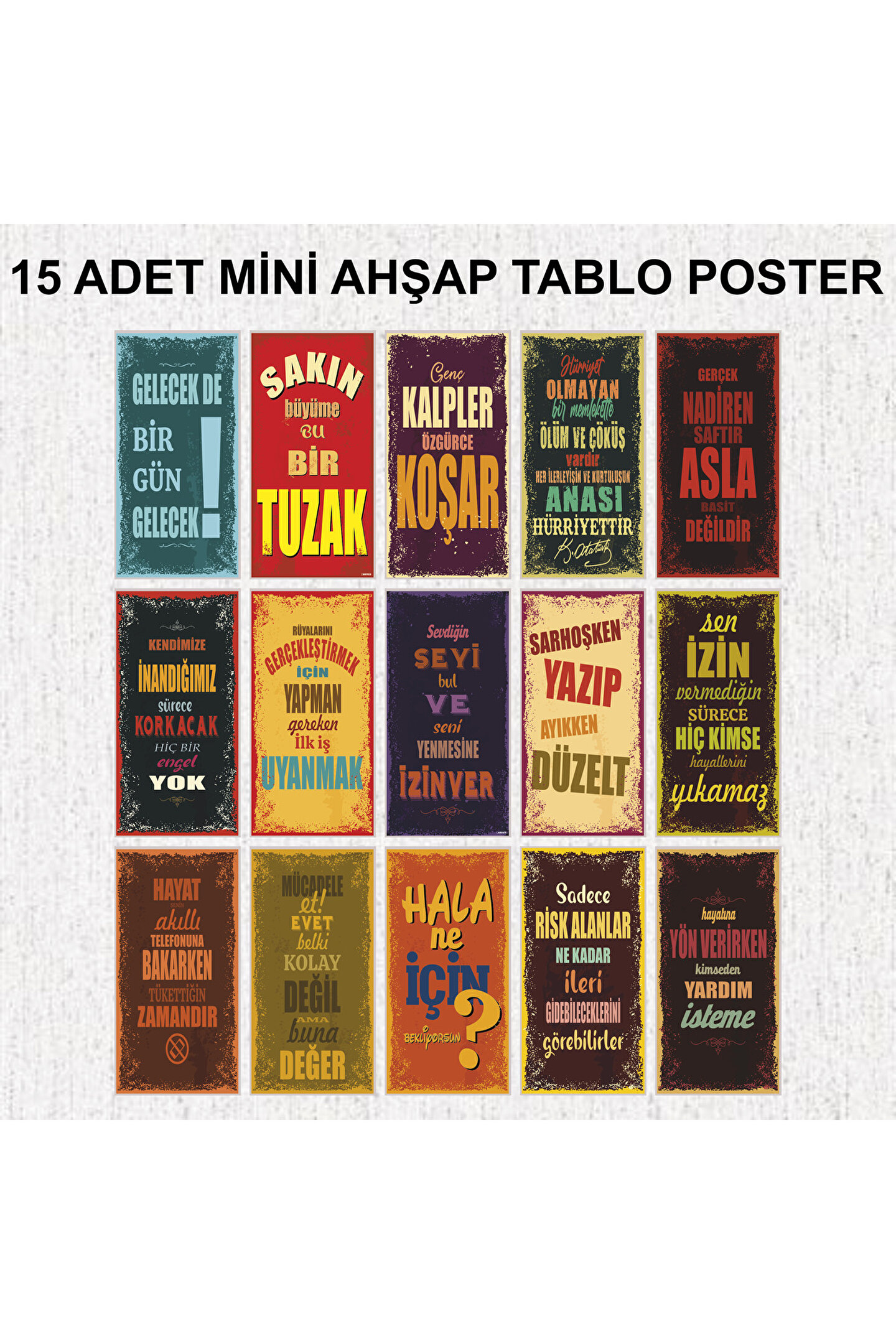 - sette 15 adet mdf ahşap poster bulunmaktadır ve her bir posterin ebatı 20x10 cm'dir. ayrıca posterlerimizin arkasında çift taraflı bantlar da bulunmaktadır.