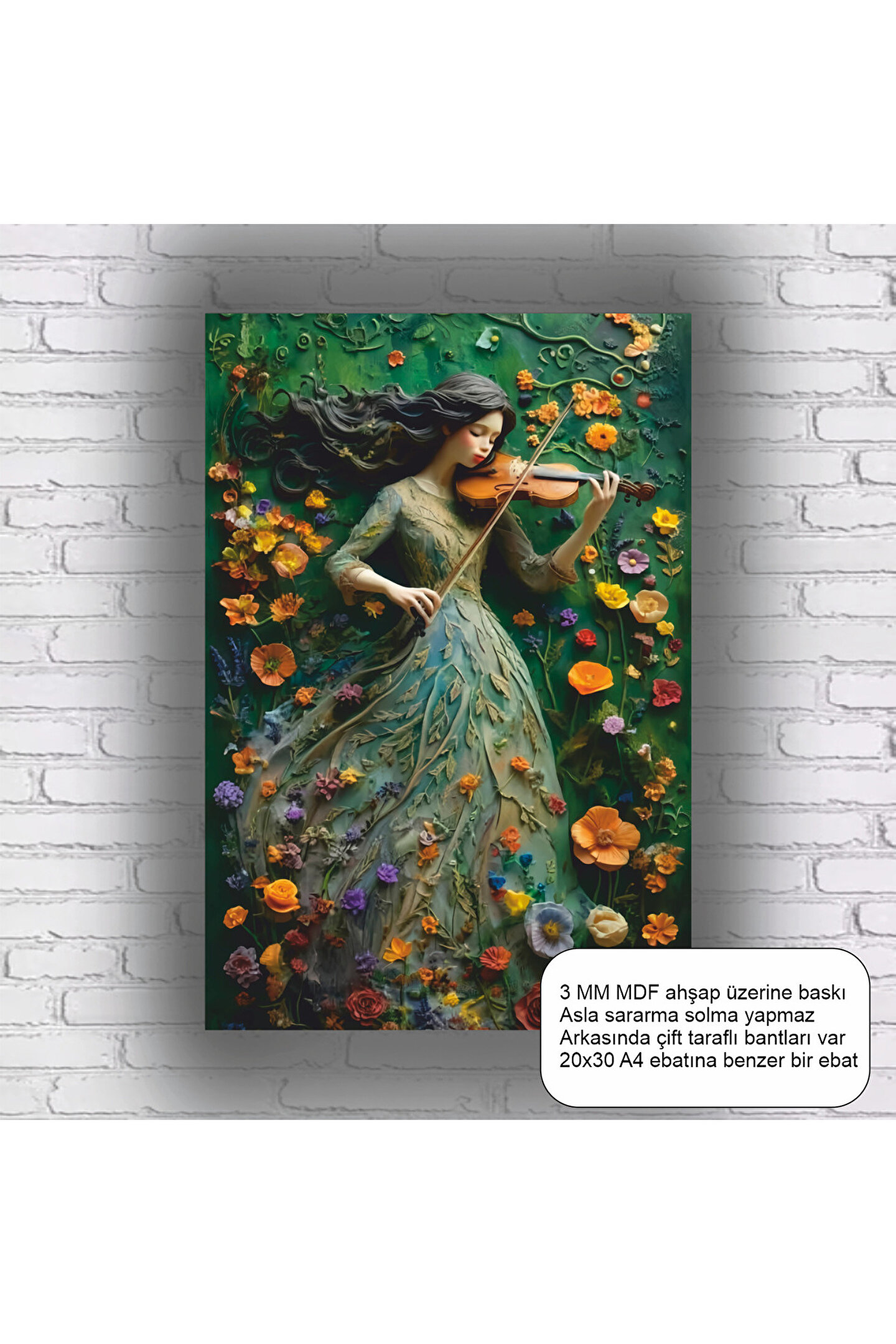 - Tek parça halinde sunulan bu estetik tablo, keman çalan bir kızın zarif görüntüsünü yansıtır.; - İnsan temalı tasarımıyla, sanatseverlerin beğenisine sunulan bu eser, duvarlarınıza sanatsal bir dokunuş katar.; - Türkiye menşeili olup, yerel üretimle kaliteyi ön planda tutan bir üründür.; - Çerçevesiz yapısı sayesinde, kişisel zevkinize göre farklı çerçeve seçenekleriyle kolayca uyum sağlar.; - MDF materyali ile dayanıklılık ve uzun ömürlü kullanım vaat ederken, aynı zamanda hafifliğiyle kolayca asılabilir.;