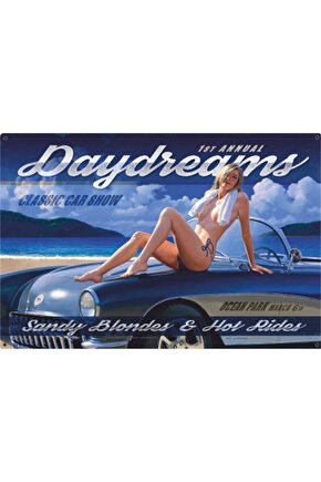 Hayat Poster Pin Up Kızı Spor Üstü Açık Klasik Araba Retro Ahşap Poster