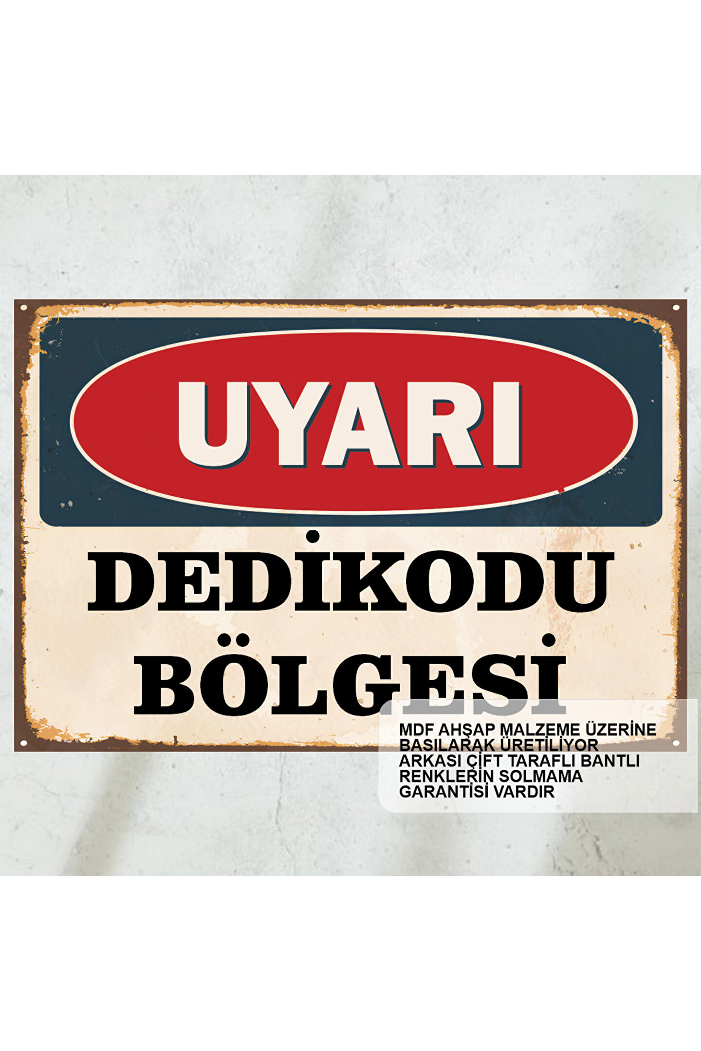 - Retro tasarımıyla dikkat çeken bu uyarı levhası, dedikodu bölgesine komik esprilerle eğlenceli bir dokunuş katıyor.; - Ahşap malzemesiyle dayanıklılığı ve estetik görünümü bir arada sunan bu poster, mekanınıza sıcak bir hava katıyor.; - Çerçevesiz yapısı sayesinde kolayca asılabilir ve istediğiniz alanda sergilenebilir; böylece her zaman gözünüzün önünde olur.; - Tek parça halinde gelen bu ürün, montaj gerektirmeyen pratik kullanım imkanı sağlıyor.; - Üretiminde kullanılan MDF materyali ile uzun ömürlü kullanım vaat ediyor ve kaliteyi hissettiriyor.