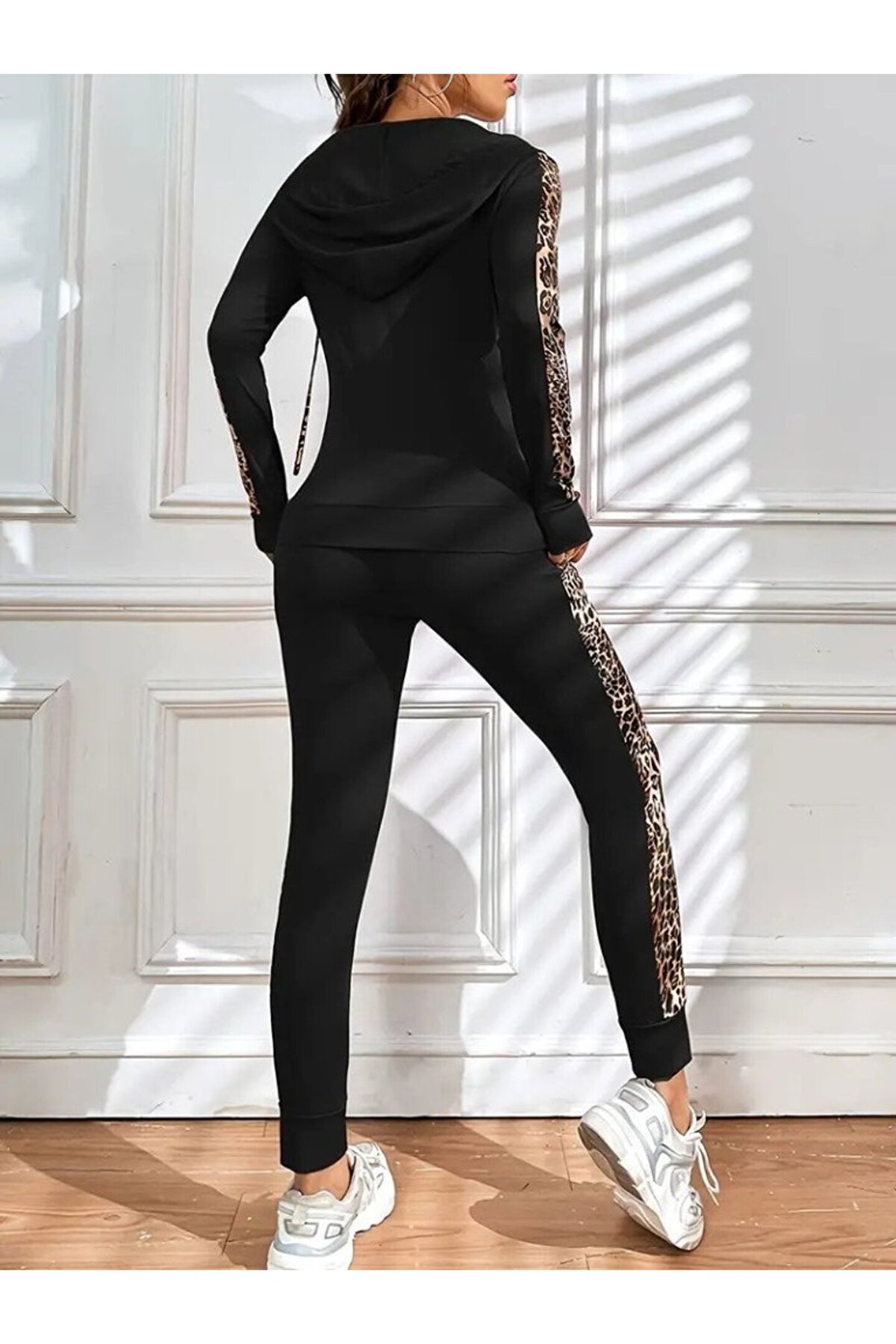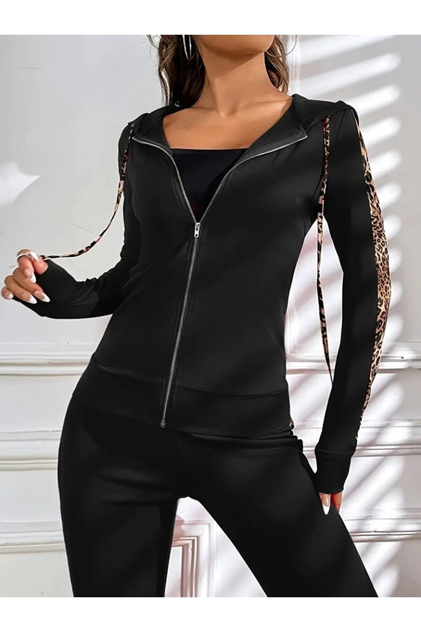 Kadın Uzun Kollu Kapşonlu Fermuarlı Bağcıklı Viskon Iki Iplik Bluz Ve Pantolon Tayt