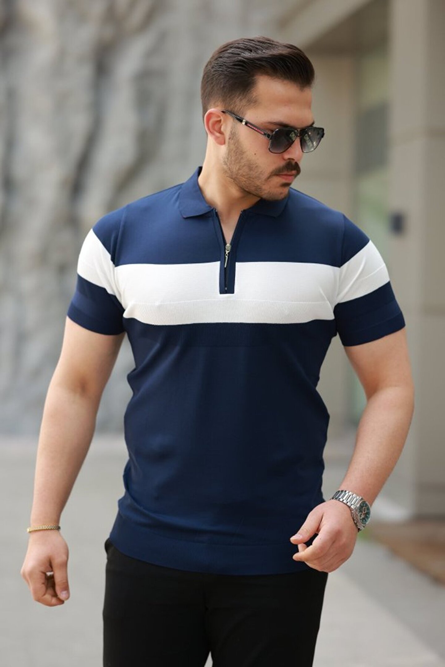 HAZEGO Erkek Fermuar Yakalı şerit Renk Desenli Kısa Kollu Tişört