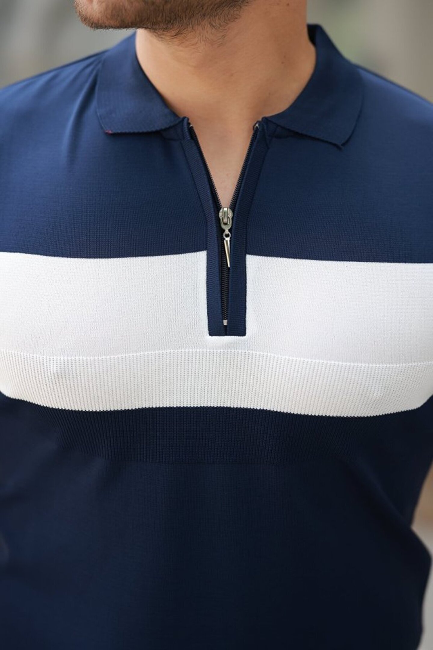 Erkek Fermuar Yakalı şerit Renk Desenli Kısa Kollu Tişört