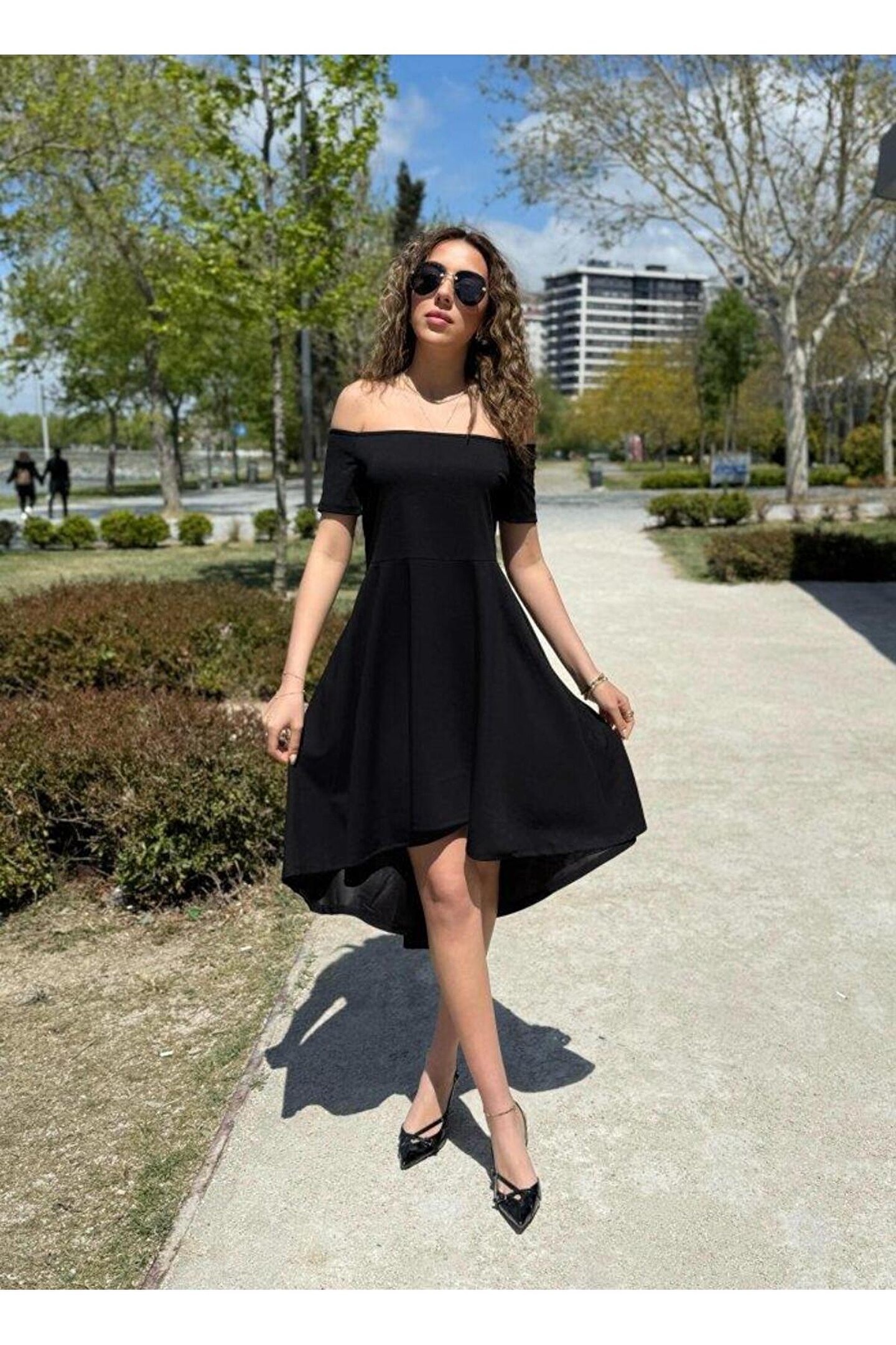 HAZEGO Kadın Kısa Kollu Madonna Yaka önü Kısa Arkası Uzun Ithal Krep Elbise