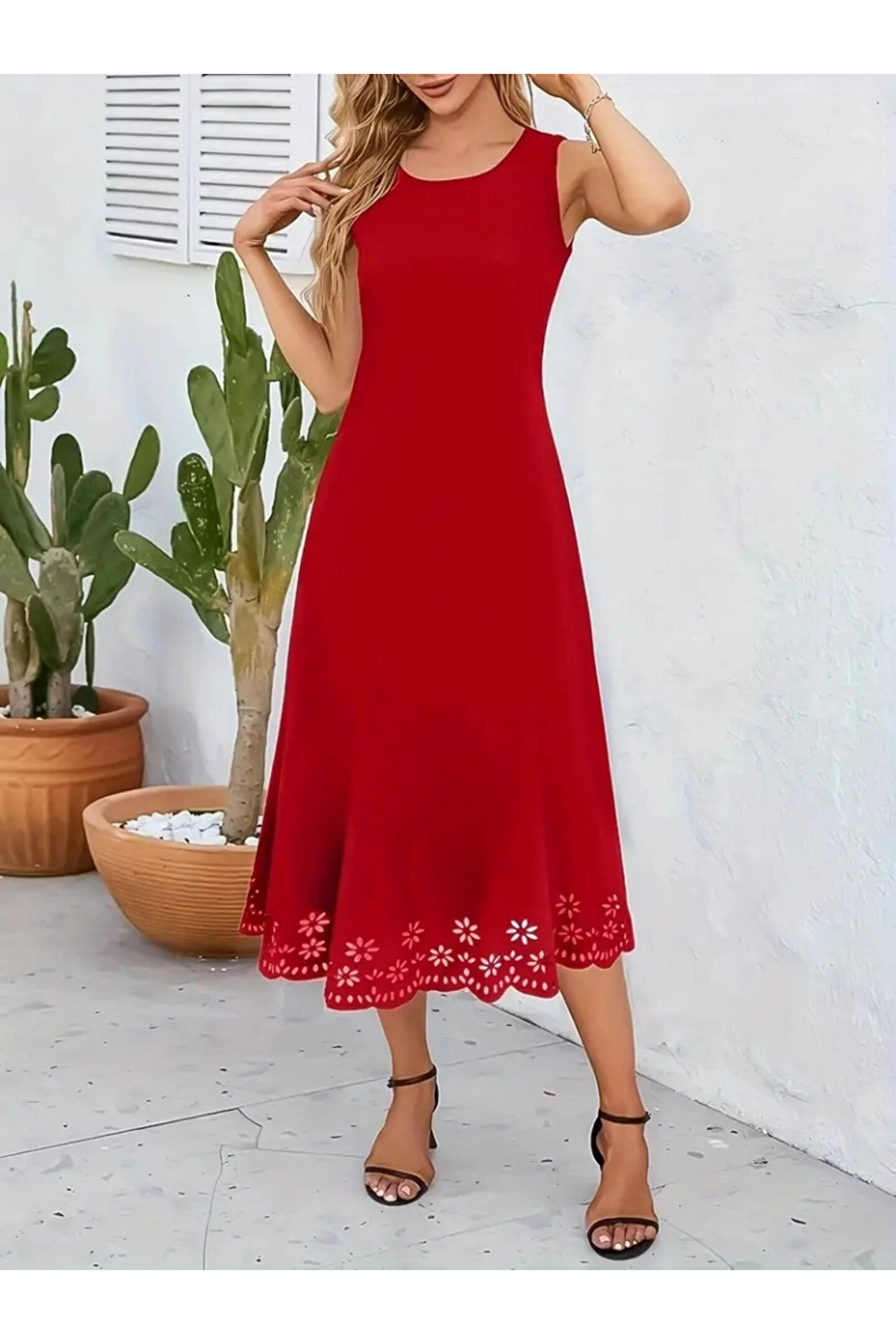 Kadın Kolsuz Etek Ucu Lazer Kesim çiçek Desenli Midi Boy Ithal Krep Elbise