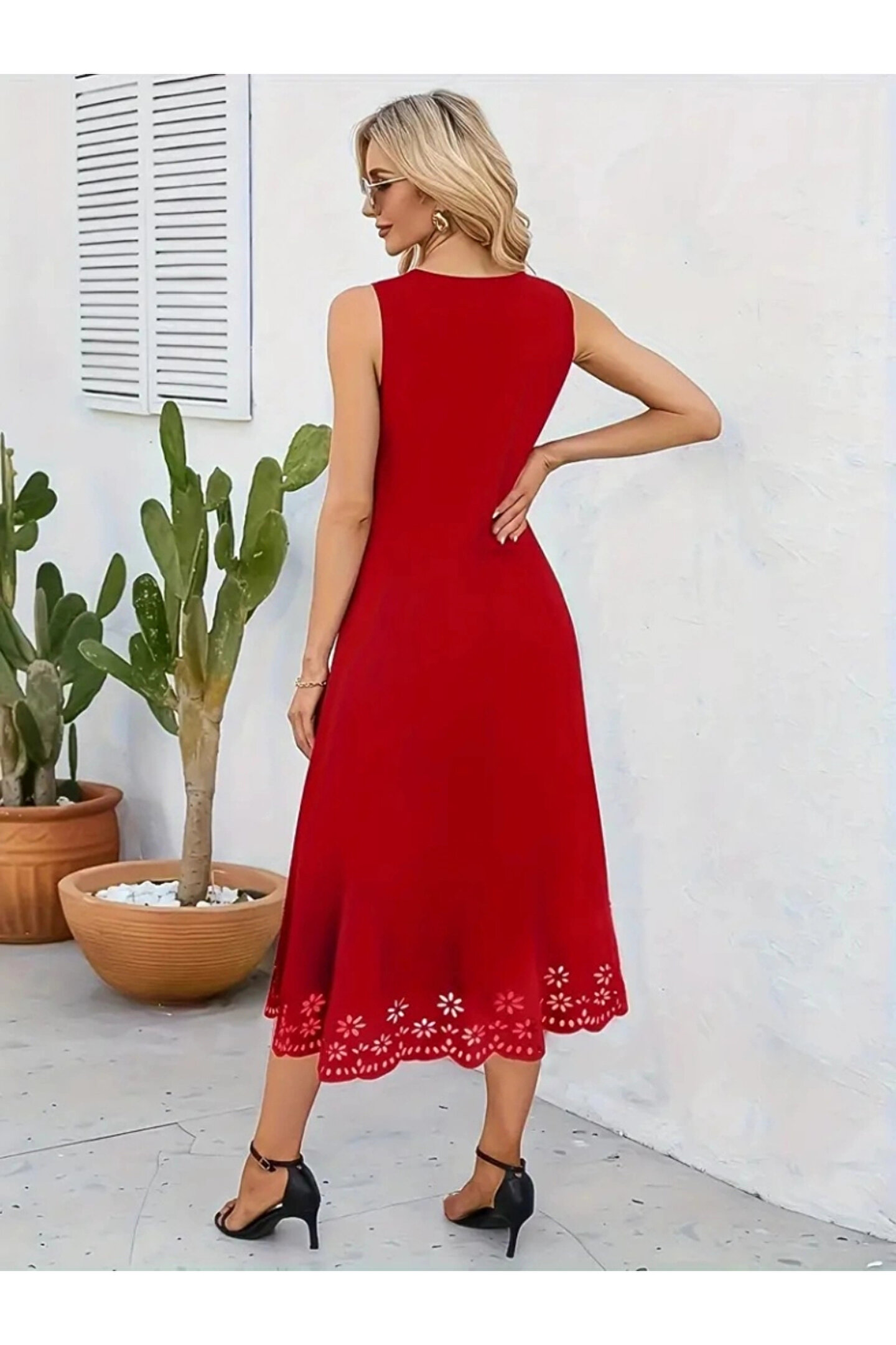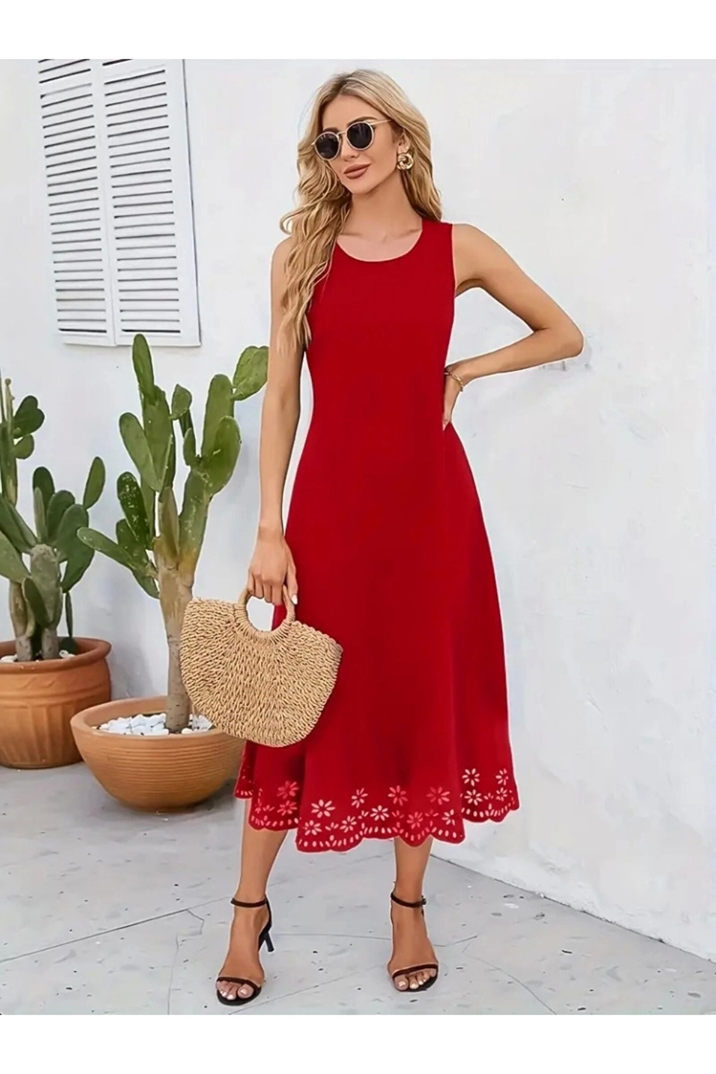 Kadın Kolsuz Etek Ucu Lazer Kesim çiçek Desenli Midi Boy Ithal Krep Elbise