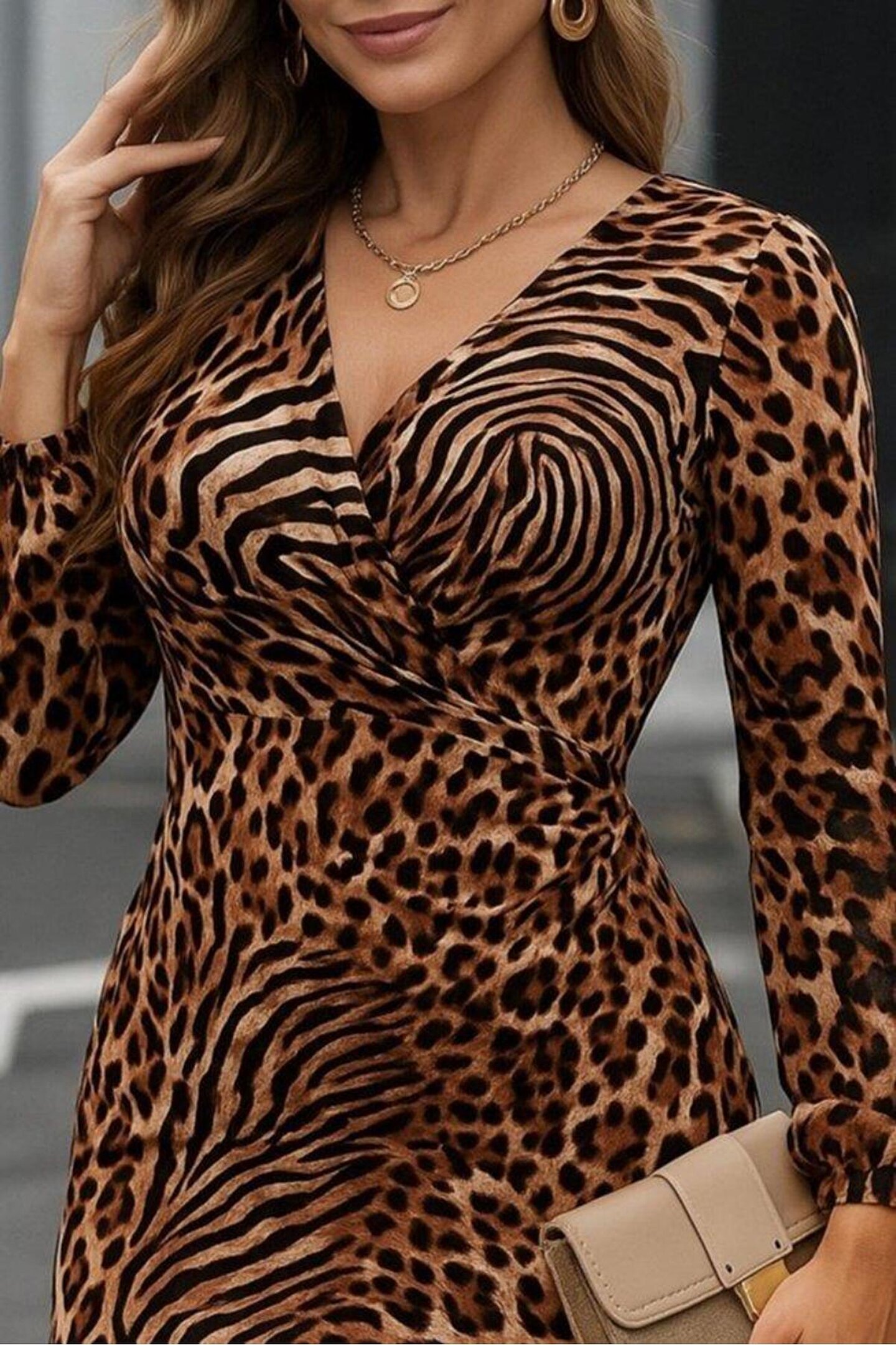 Kadın Uzun Kollu Kruvaze Yaka Leopar Desen Mikro Elbise