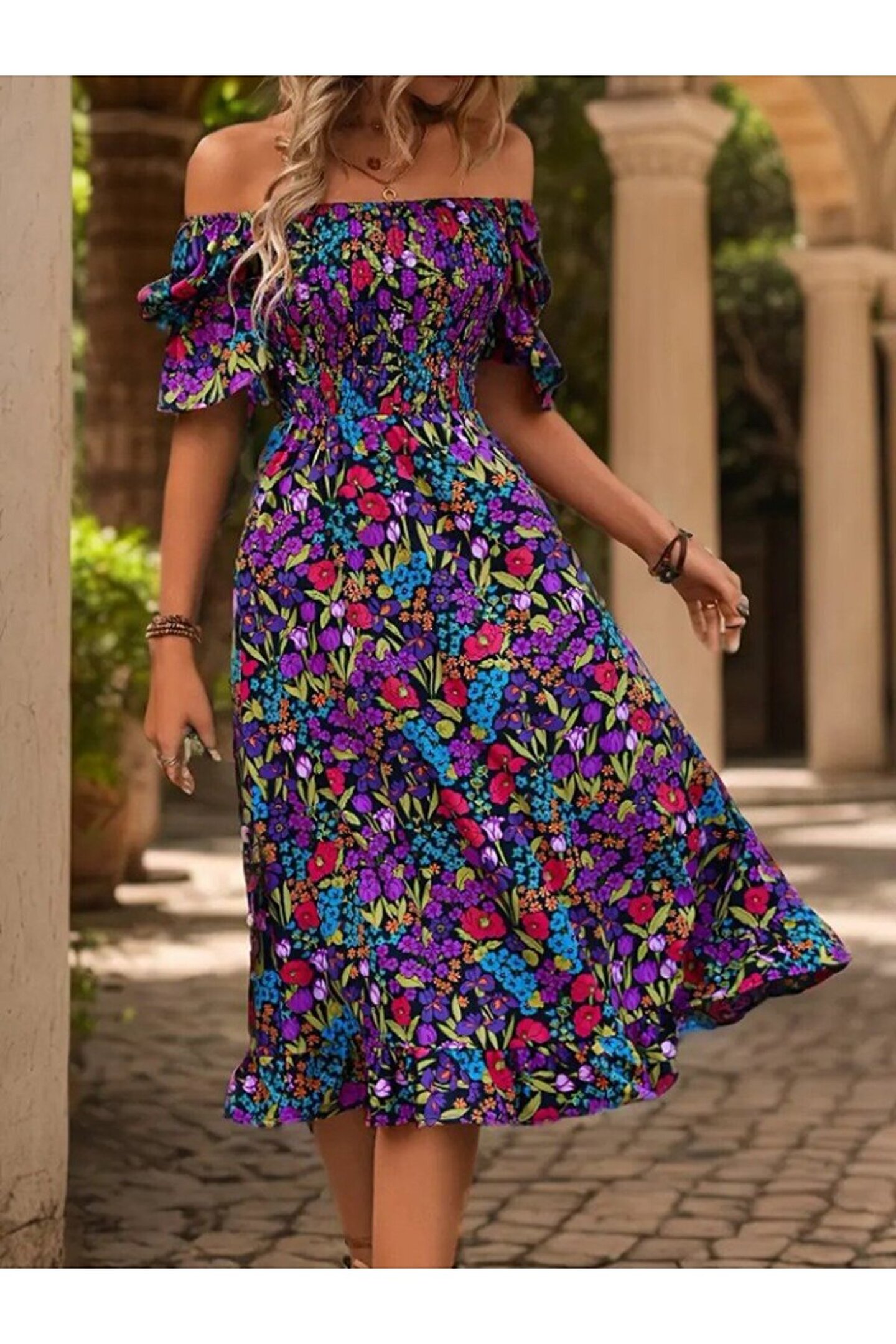 HAZEGO Turega Style Kadın Kısa Kollu Kare Yakalı Beli Lastikli çiçek Desenli Mini Süprem Elbise