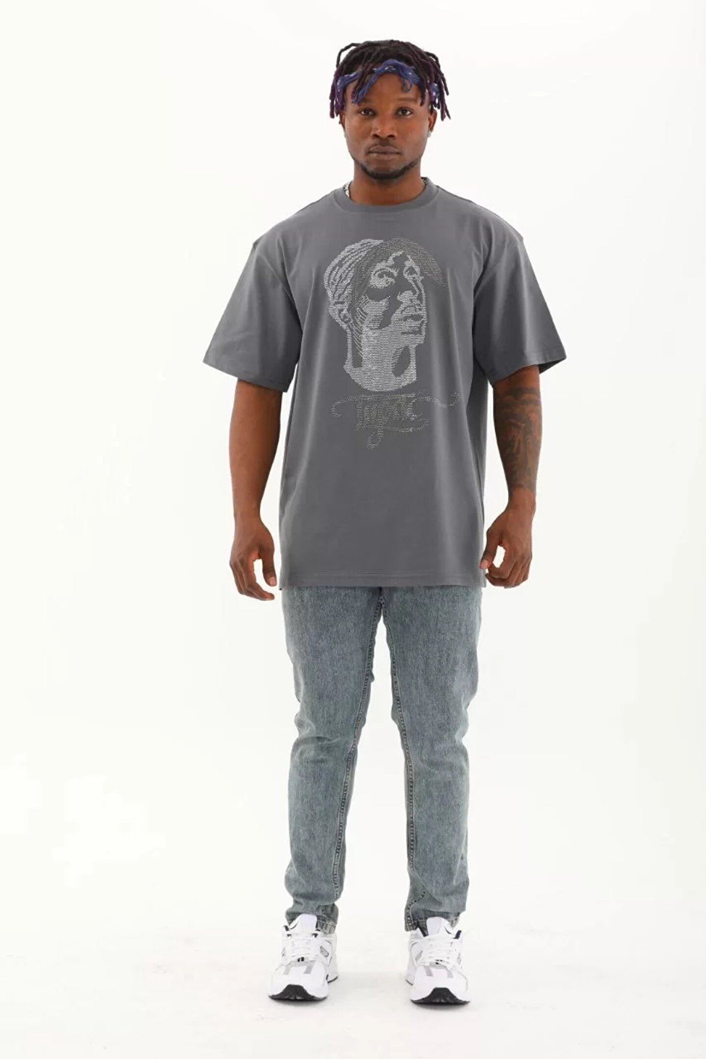 Unisex Oversize Taşlı Bisiklet Yaka T-Shirt - Füme