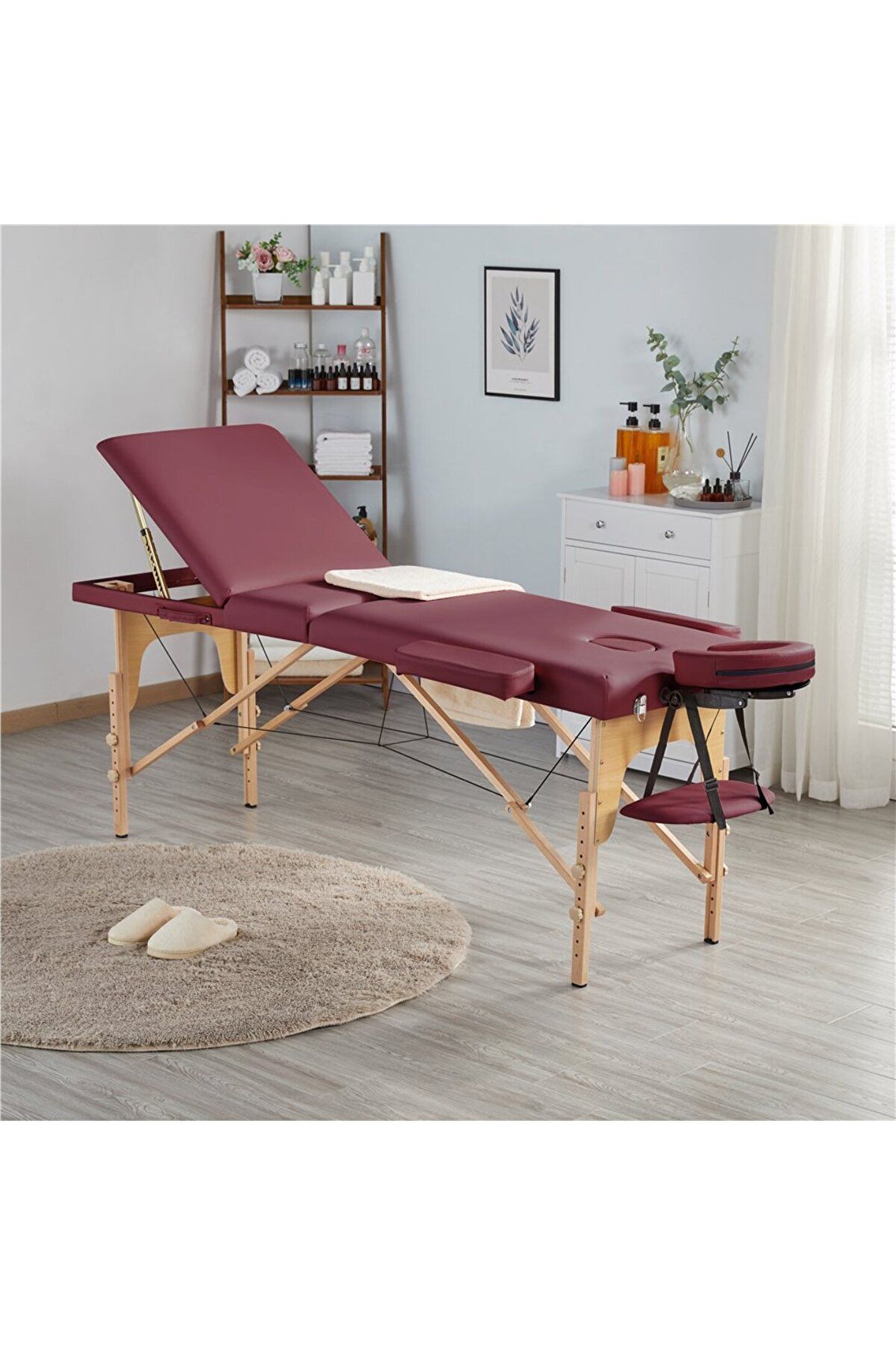 Katlanabilir 3 Parçalı Ahşap Masaj Masası, çanta Tipi Masaj Ve Tedavi Yatağı Bordo
