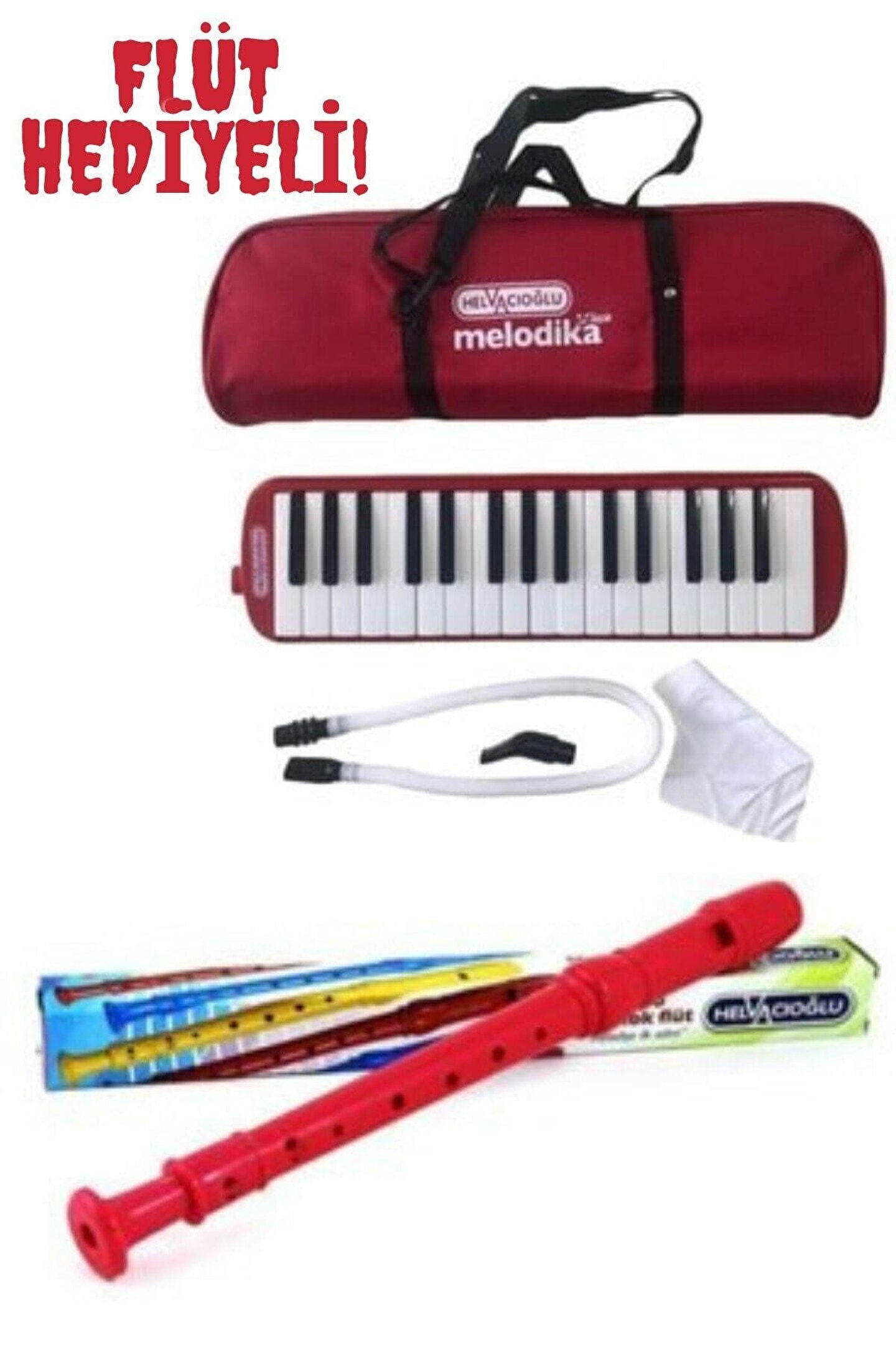 1 Adet 32 Tuşlu Melodika Çantalı ; Çanta içinde temizleme bezi, üfleme borusu ve melodika mevcuttur. ; Renk kırmızı ; 1 Adet Helvacıoğlu Flüt Kırmızı ;