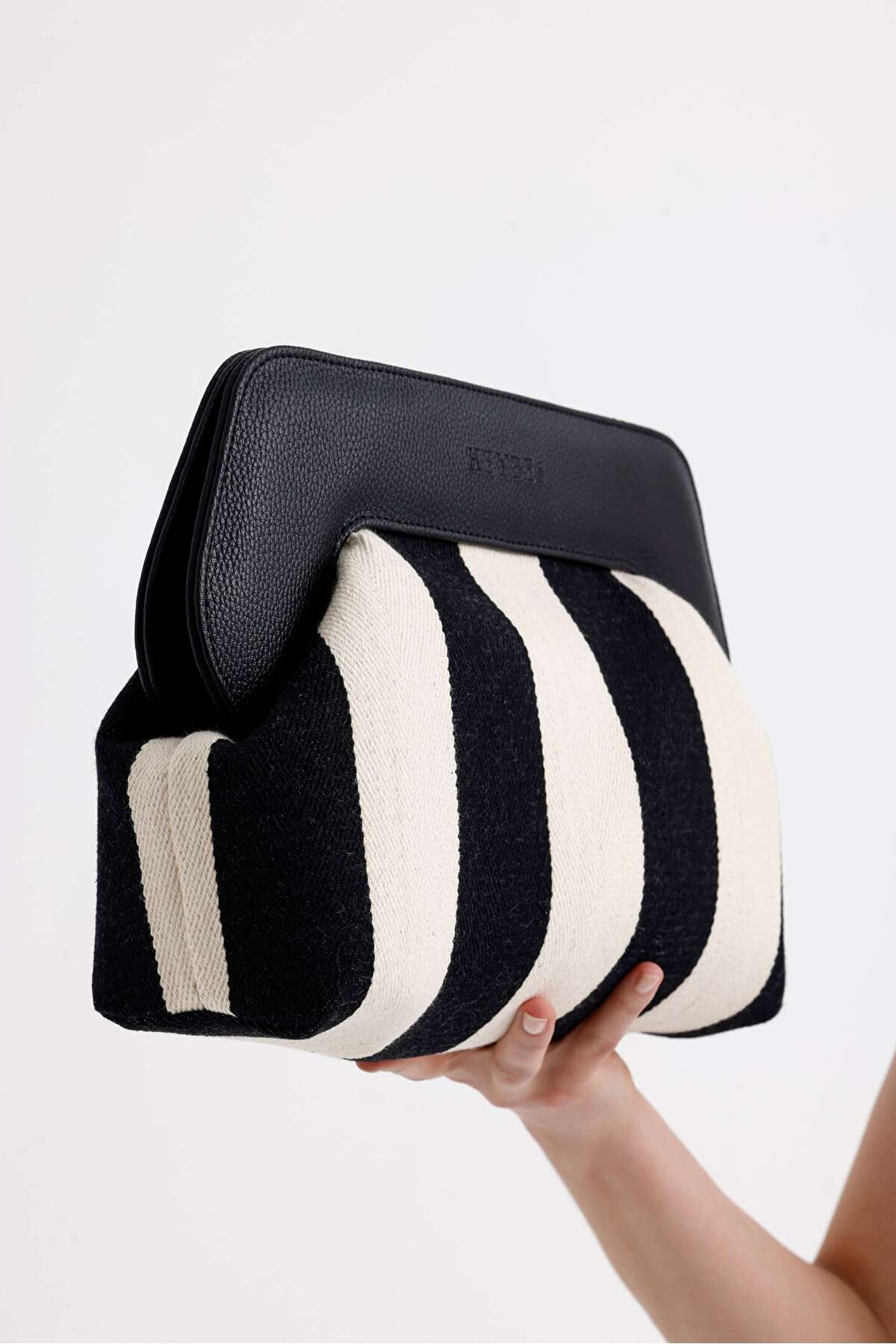 Heybes Kadın Siyah Çizgi Desenli Kanvas Clutch El Çantası; Göz alıcı çizgi desenleriyle öne çıkan bu clutch çanta, günlük kullanımda şıklığınızı tamamlar.; Çizgi desenli dokuma kanvas kumaştan, özel el işçiliği ile üretilmiştir.; Dokuma kumaş yapısı dayanıklılık ve konfor sunarken, tekstil materyali hafif ve rahat bir taşıma deneyimi sağlar.; Vegan deri detayları modern ve zarif bir görünüm kazandırır.; İç kısmı astarlı olup 1 adet iç cebe sahiptir.; Mıknatıs kapak sistemi pratik kullanım imkânı sunar.; Heybes tarafından özel el işçiliği ile üretilmiştir.; ; İç kısmı astarlıdır ve 1 adet iç cebi bulunmaktadır.; •Gövde: Kanvas Dokuma Kumaş •Çerçeve: Vegan Deri •İç Materyal: Vegan Deri; 34x23x11 cm (Genişlik x Yükseklik x Derinlik) ölçülerindedir.; • İç hacim yükseklik: 16 cm • İç hacim genişlik: 18 cm