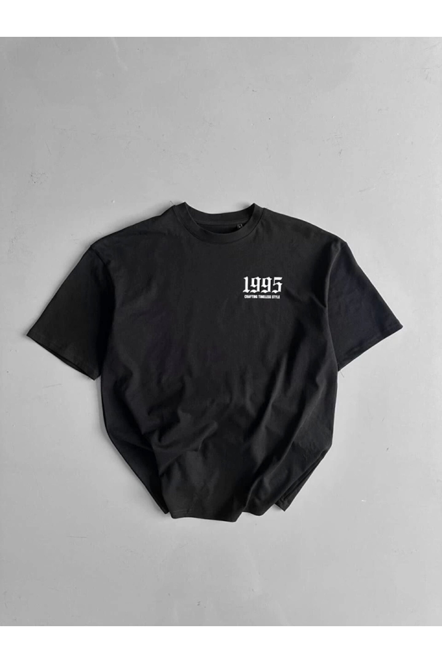 Baskılı Oversize Bisiklet Yaka T-shirt - Siyah