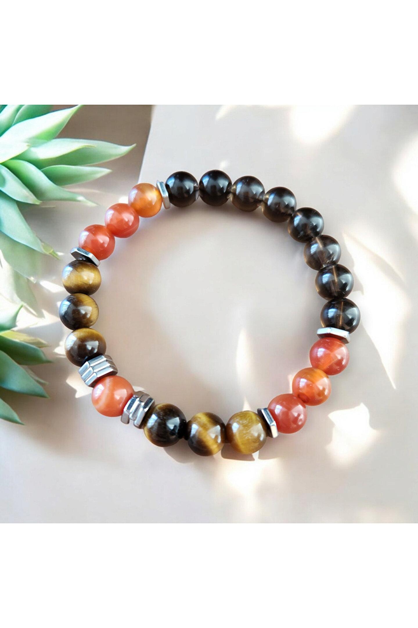 Doğal taş materyali ile üretilmiş, şıklığı ve doğallığı bir arada sunan bileklik; Akik, kaplangözü ve dumanlı kuvars gibi nadir bulunan taşların birleşimiyle benzersiz bir tasarım; Her bileklik, el yapımı olup, her bir parçanın kendine özgü desen ve renk tonlarına sahip olmasıyla dikkat çeker;
