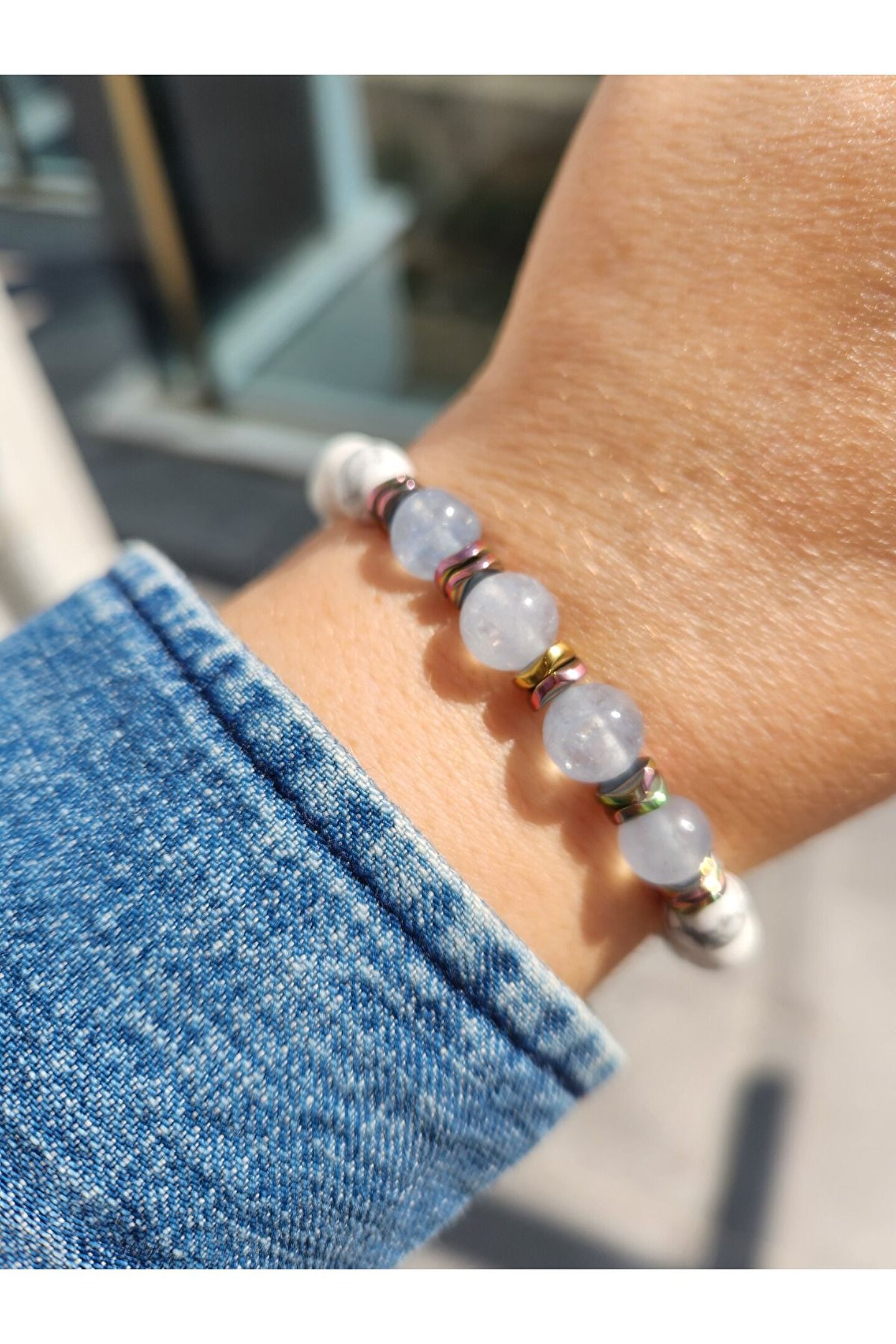 Doğal taş kullanımı sayesinde her bileklik benzersiz ve özgün bir görünüm sunar; Akuamarin ve havlit taşı kombinasyonu, şıklığı ve zarafeti bir arada barındırır; Doğal taşların renk ve desen çeşitliliği, her türlü kıyafetle uyum sağlar ve kişisel tarzınıza eşsiz bir dokunuş katar; Doğal taşların sağladığı enerji ve pozitif titreşimler, günlük yaşamınızda pozitif bir etki yaratır; El yapımı olması, her bir bilekliğin kendine özgü bir hikayesi ve geçmişi olduğunu hissettirir;