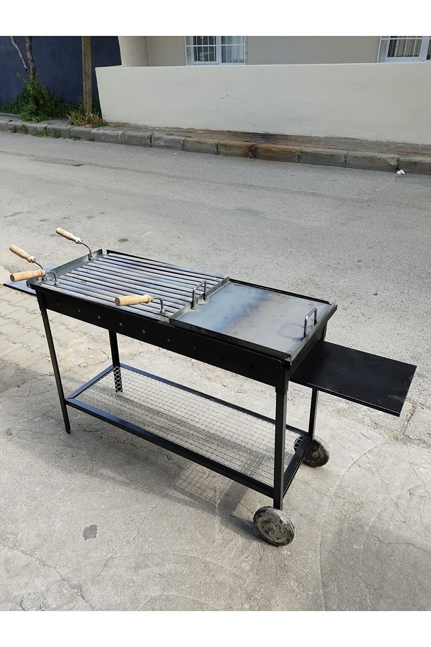 İklim Mangal, Oluklu Izgara 40x60 pleyt tava kısmı 40x40 ,Ayaklar 75 m geçmelidir , altında 32; 5x100 raf vardır odun kömür koymak için , toprak zemine uygun tekerlekleri mevut 2 adet 25x30 tencere tepsi koyma yeri mevcut mangal kasası 1; 5mm ızgaralar 2 mm ahşap saplı saplar sökülebilir tüm parçalararı geçmelidir sökülünce normal bir taksi bagajına girebilicek boyuta gelir iç hazne derinliği 9 cm dir toplam ağırlığı 35 kilogram evliyadiyelik bir mangal dır;